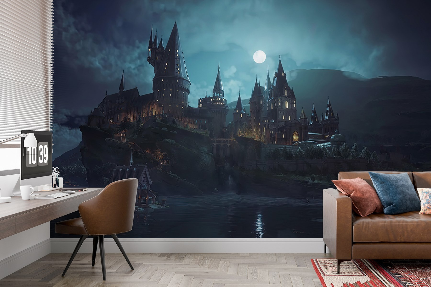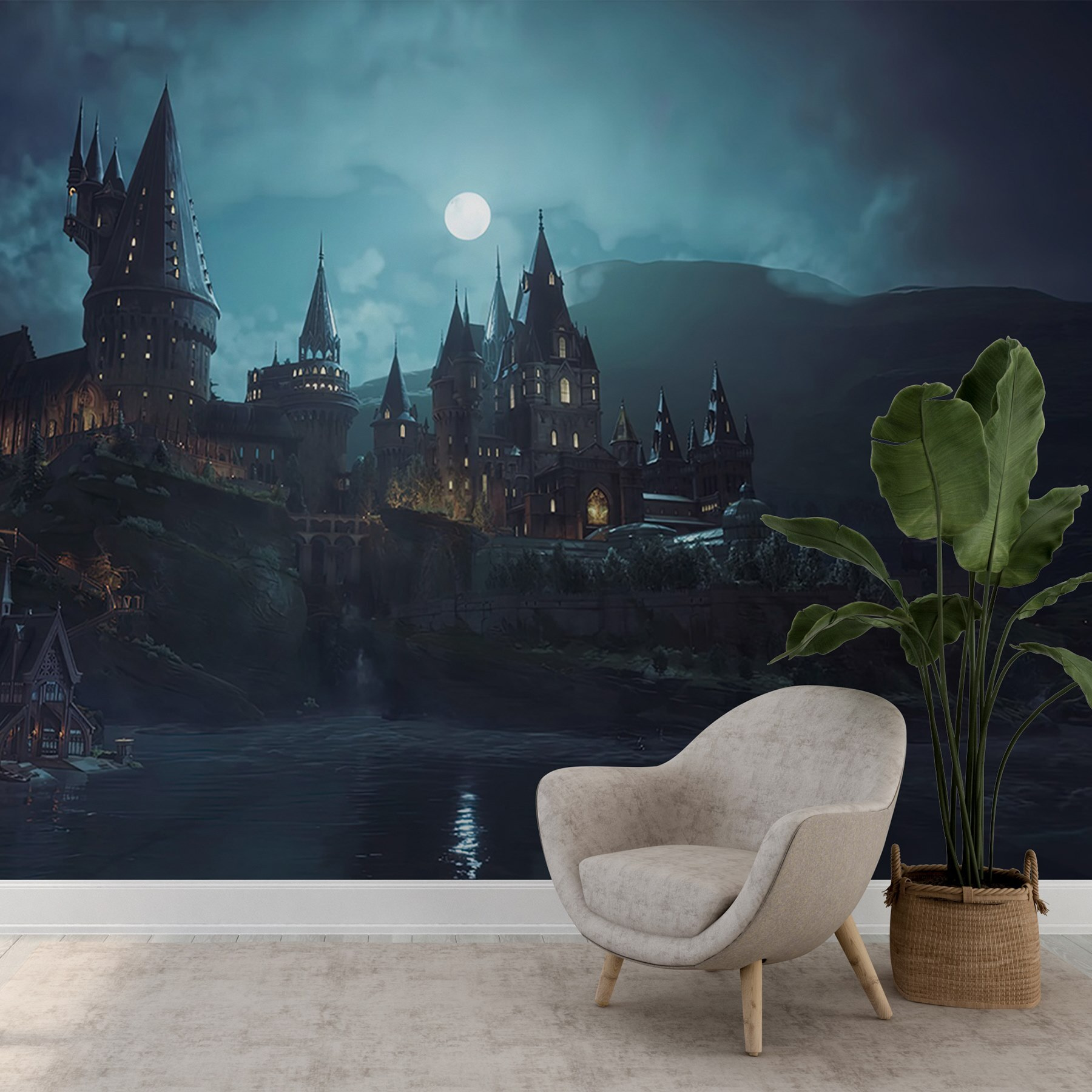 Verander je ruimte in een dromerig toevluchtsoord met deze betoverende muurschildering met een kasteel op een heuvel onder een gloeiende maan. Stel je eens gezellige avonden voor met het staren naar de majestueuze torens en het omarmen van de magie van de nacht. Het is alsof je een sprookje binnenstapt, gewoon in je woonkamer. De zachte blauwtinten en donkere schaduwen creëren een rustgevende sfeer, perfect om tot rust te komen na een lange dag. Vrienden zouden je zelfs kunnen vragen of je in een ander rijk bent geweest! Deze muurschildering is niet alleen kunst; het nodigt uit tot dagdromen en stimuleert gesprekken, waardoor elke muur een boeiend middelpunt wordt.
