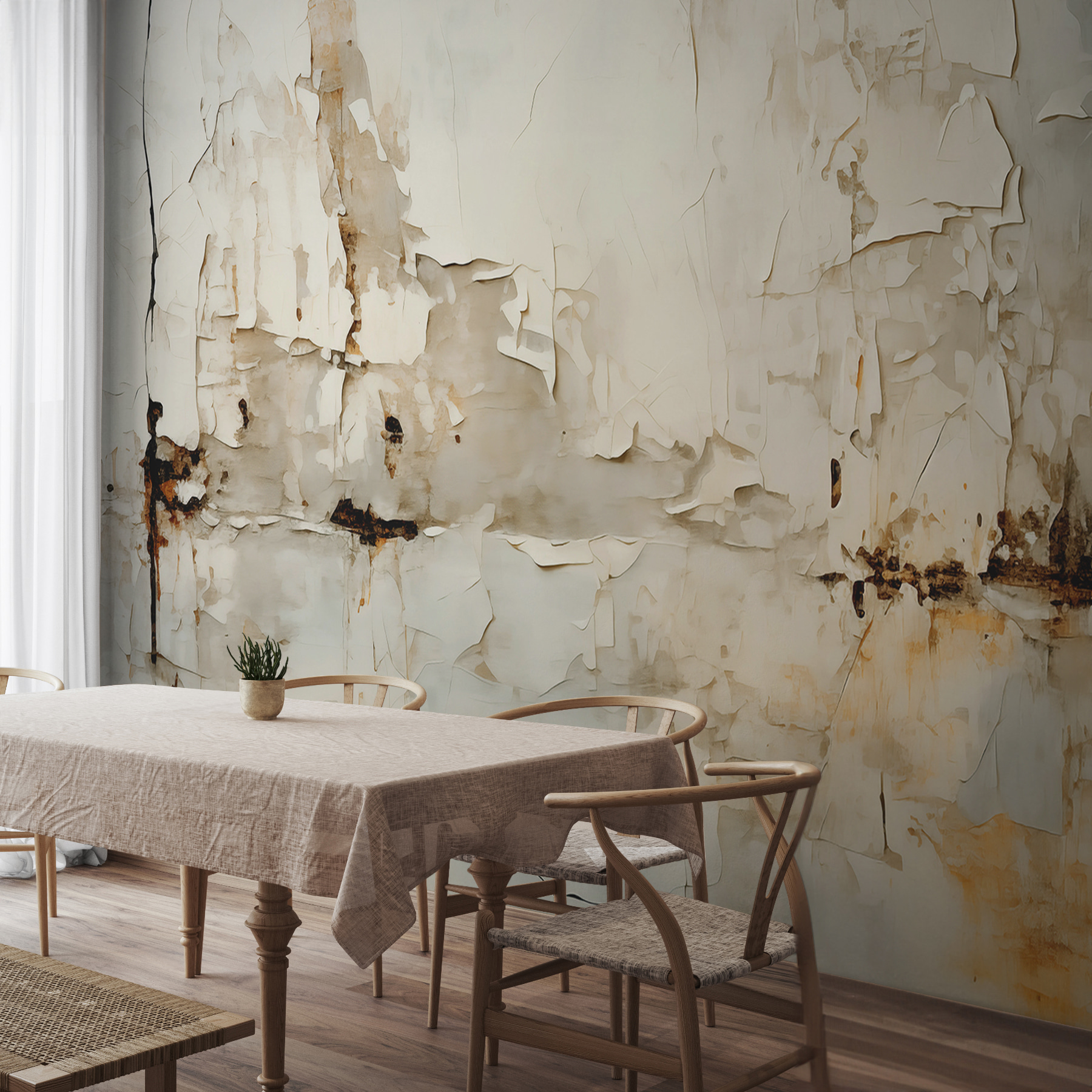 Stel je eens voor dat je een kamer binnenstapt waar de muren verhalen uit de tijd fluisteren. Deze muurschildering met zijn zachte, afbladderende verf en gedempte tinten doet precies dat. Het geeft een sfeer weer die zowel kunstzinnig als enigszins verweerd is en verwijst naar herinneringen en beleefde momenten. Het is alsof je een oud, mooi boek vindt in een zee van nieuwe boeken. Perfect voor die knusse hoekjes of die onverwachte accentmuur, het nodigt uit tot een chille sfeer, die aanzet tot luie middagen of diepe gesprekken bij de koffie. Waarom laat je je ruimte niet een verhaal vertellen? Een vleugje elegantie met een twist, deze muurschildering mengt moeiteloos charme met een vleugje nostalgie.