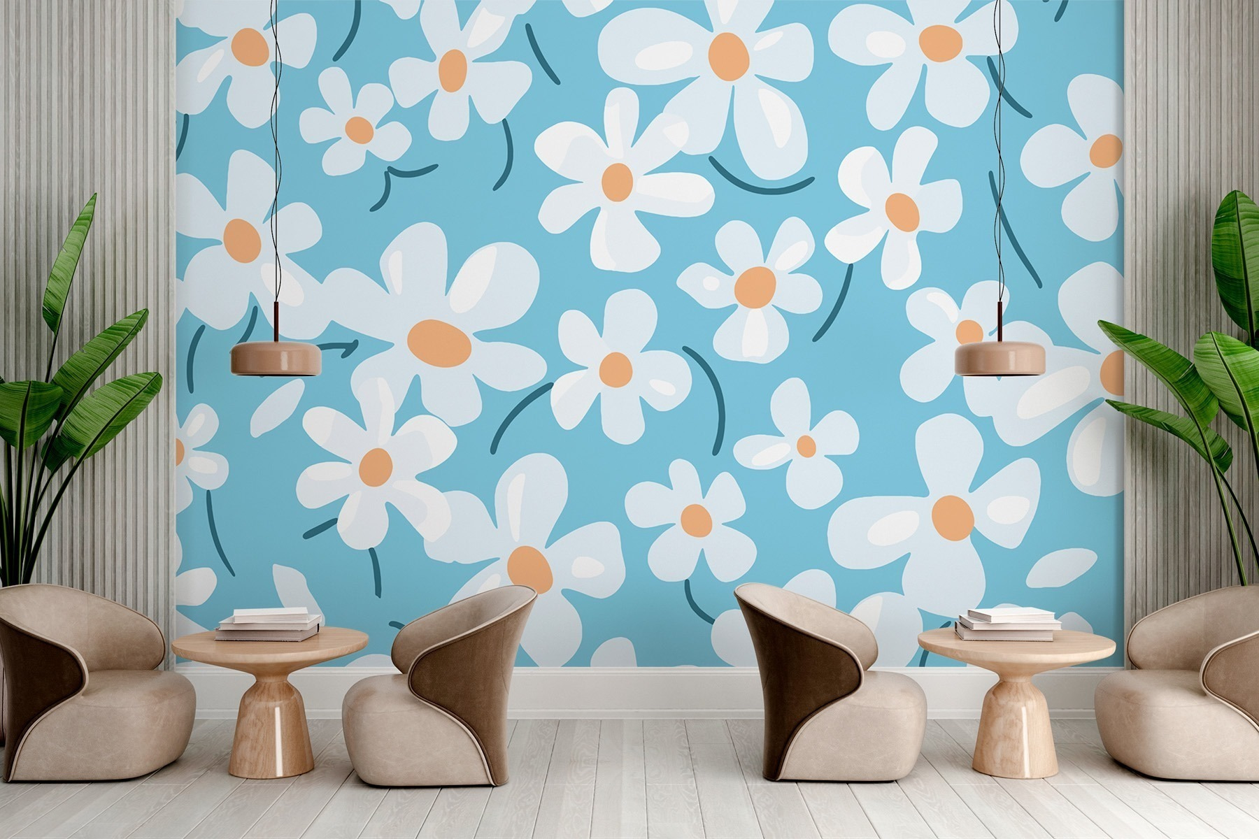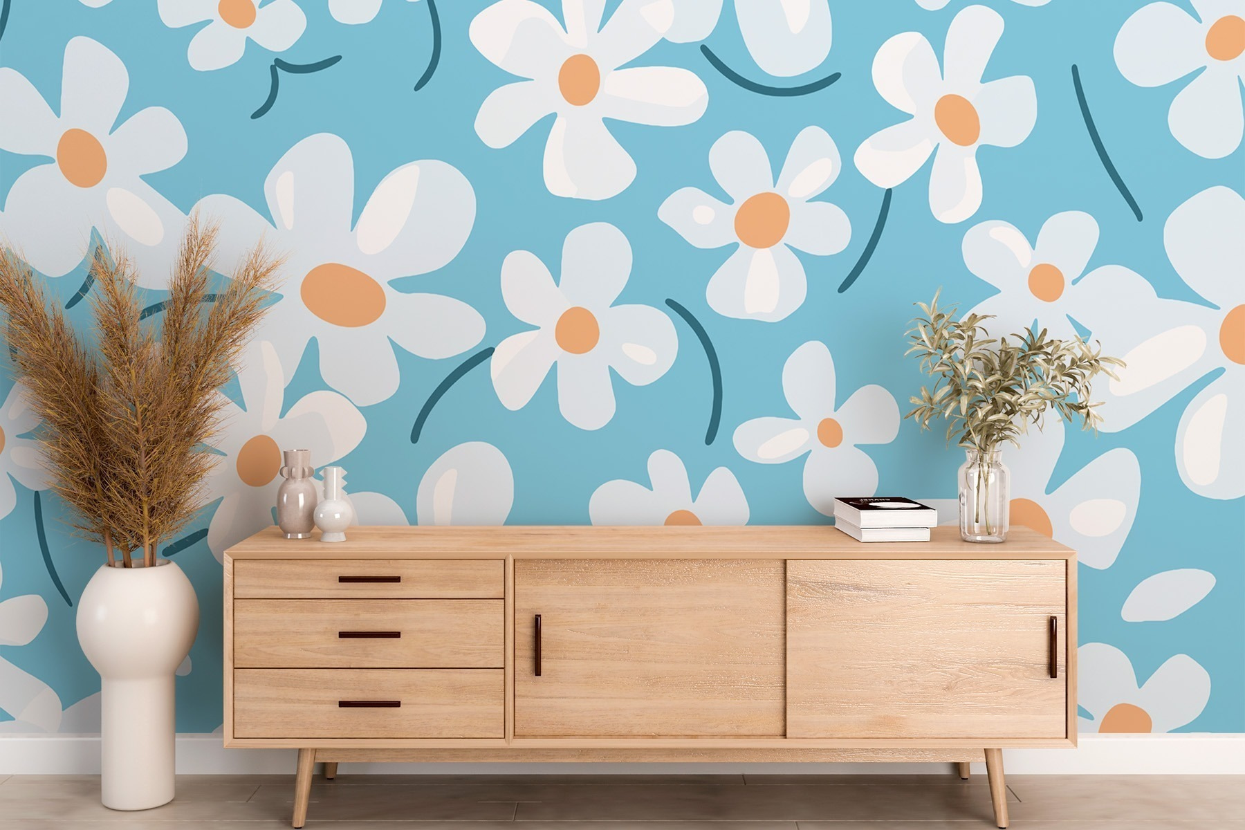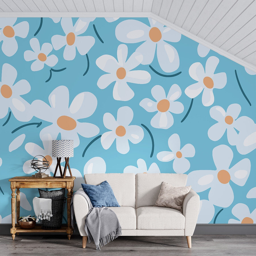 Transformeer je ruimte met de charme van dit speelse “Muurschilderingen Patroon van Witte Bloemen”. Stel je een zonnige tuin voor op je muren! Deze levendige bloemen dansen over een rustgevende blauwe achtergrond en fleuren elke kamer direct op. Stel je voor dat je koffie drinkt in een gezellig hoekje, omringd door deze vrolijke bloemen – het is alsof je een stukje natuur in huis haalt! Perfect voor een woonkamer, kinderkamer of elke andere plek die een frisse uitstraling nodig heeft. En wie wil er nu niet het gevoel hebben dat hij constant omringd wordt door een mooie lentedag? Laat de bloemen hun magie doen!