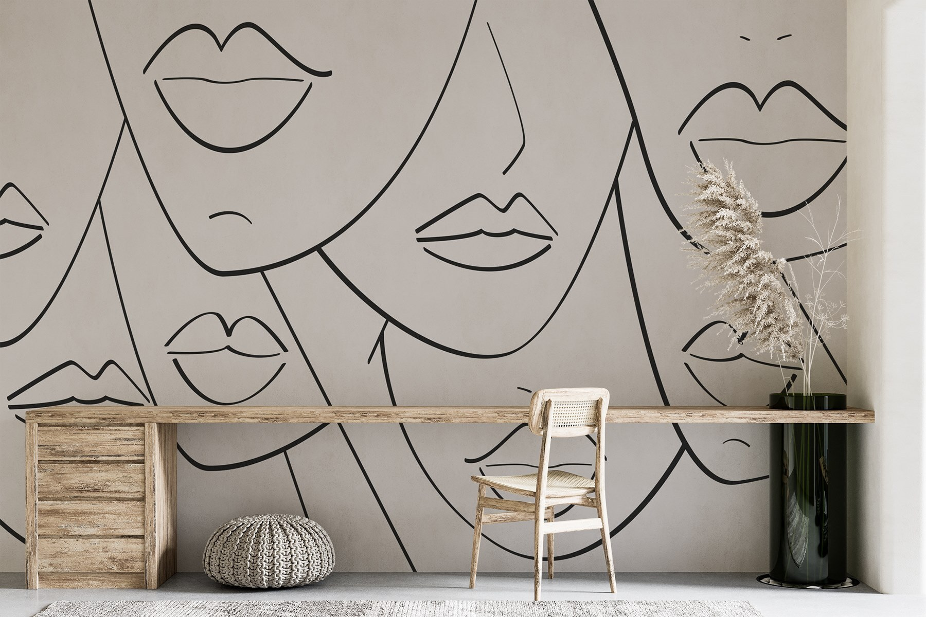 Transformeer je ruimte met deze boeiende muurschildering met een groep abstracte gezichten, elk met uniek getekende lippen in opvallend zwart en wit. Het is niet alleen decor; het is een conversatiestarter. Stel je voor dat je een kamer binnenloopt en begroet wordt door deze intrigerende uitdrukkingen, die elk een ander verhaal vertellen – wat is hun sfeer, welke geheimen hebben ze?