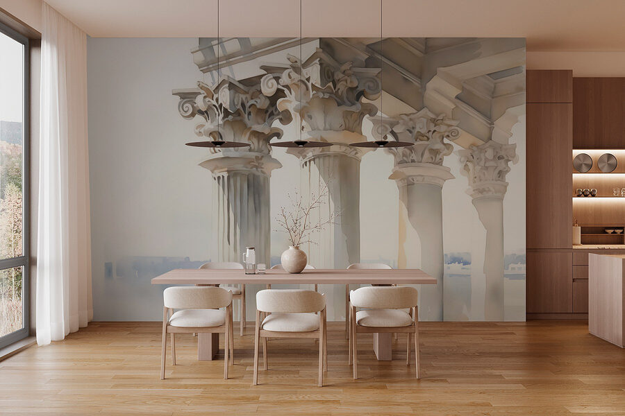 Verander elke ruimte in een serene ontsnapping met deze fascinerende aquarelmuurschildering van een groots gebouw omlijst door zacht deinende zuilen. Het is alsof je een stukje zachte, dromerige architectuur direct op je muren verwelkomt. Stel je voor dat je aan je koffie nipt of lekker wegkruipt met een boek en het gevoel hebt dat je verdwaald bent in een stil stadslandschap. De gedempte tinten nodigen uit tot ontspanning en creativiteit – perfect voor die “ik heb even een moment nodig”-middagen. Het is een kunstzinnige manier om een statement te maken zonder al te veel poespas. Wie wist dat stijl toevoegen zo moeiteloos magisch kon zijn?