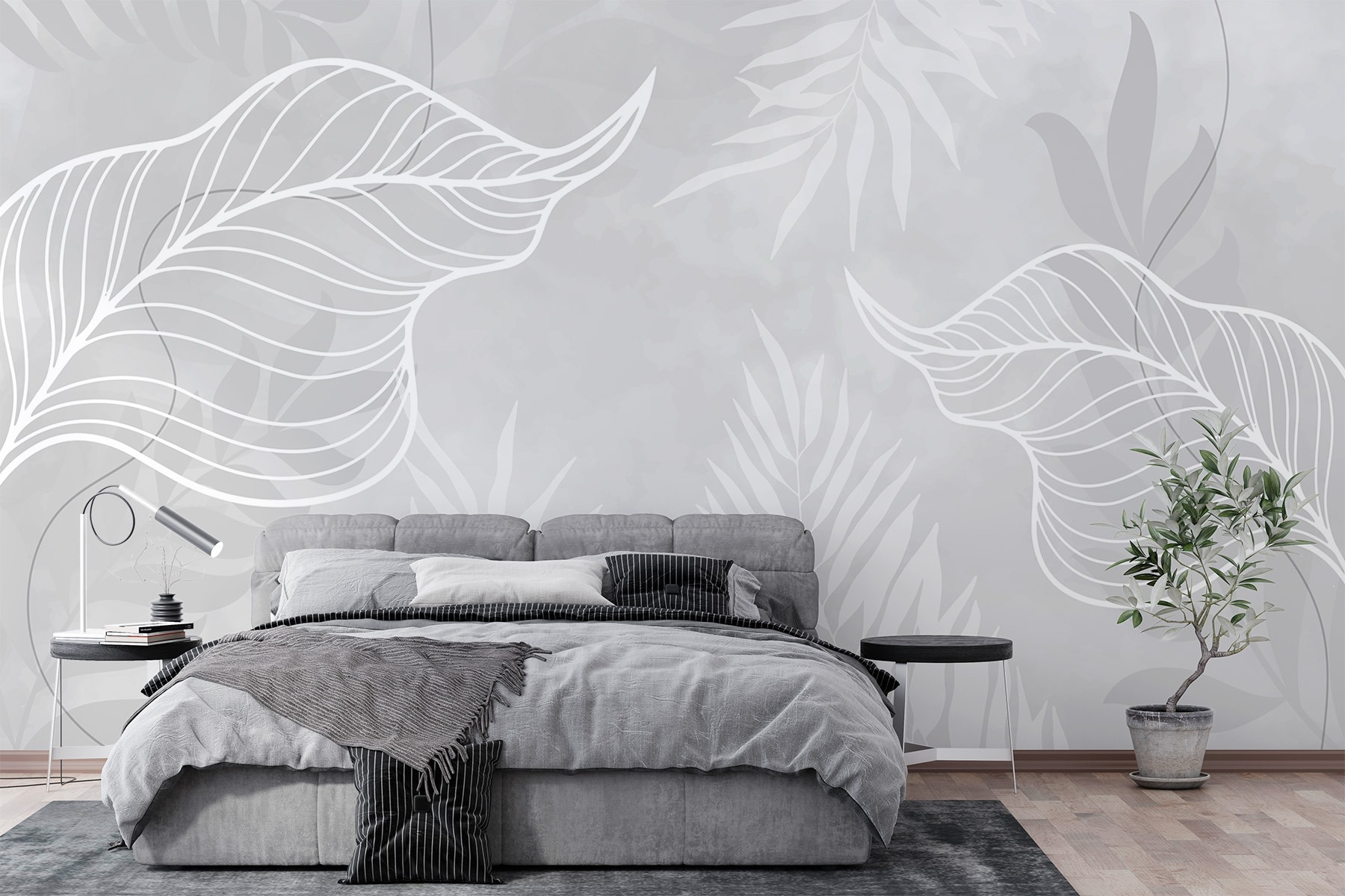 Transformeer elke ruimte met de intrigerende charme van deze muurschildering met delicate witte bladeren op een zachtgrijze achtergrond. Stel je eens voor dat je een gezellige kamer binnenstapt waar die bladerige silhouetten lichtjes tegen de muur dansen en een frisse, luchtige sfeer creëren. Het is alsof je de buitenlucht naar binnen haalt – perfect voor luie middagen die je doorbrengt onder het genot van een kopje koffie of als gastheer voor vrienden. Het subtiele kleurenschema past goed bij de meeste inrichtingsstijlen, waardoor het een veelzijdige keuze is. Of je nu streeft naar een rustige sfeer of een vleugje elegantie, deze muurschildering voegt een unieke flair toe. Misschien betrap je jezelf er wel op dat je aan het dagdromen bent over waar die grillige bladeren rondzwerven.