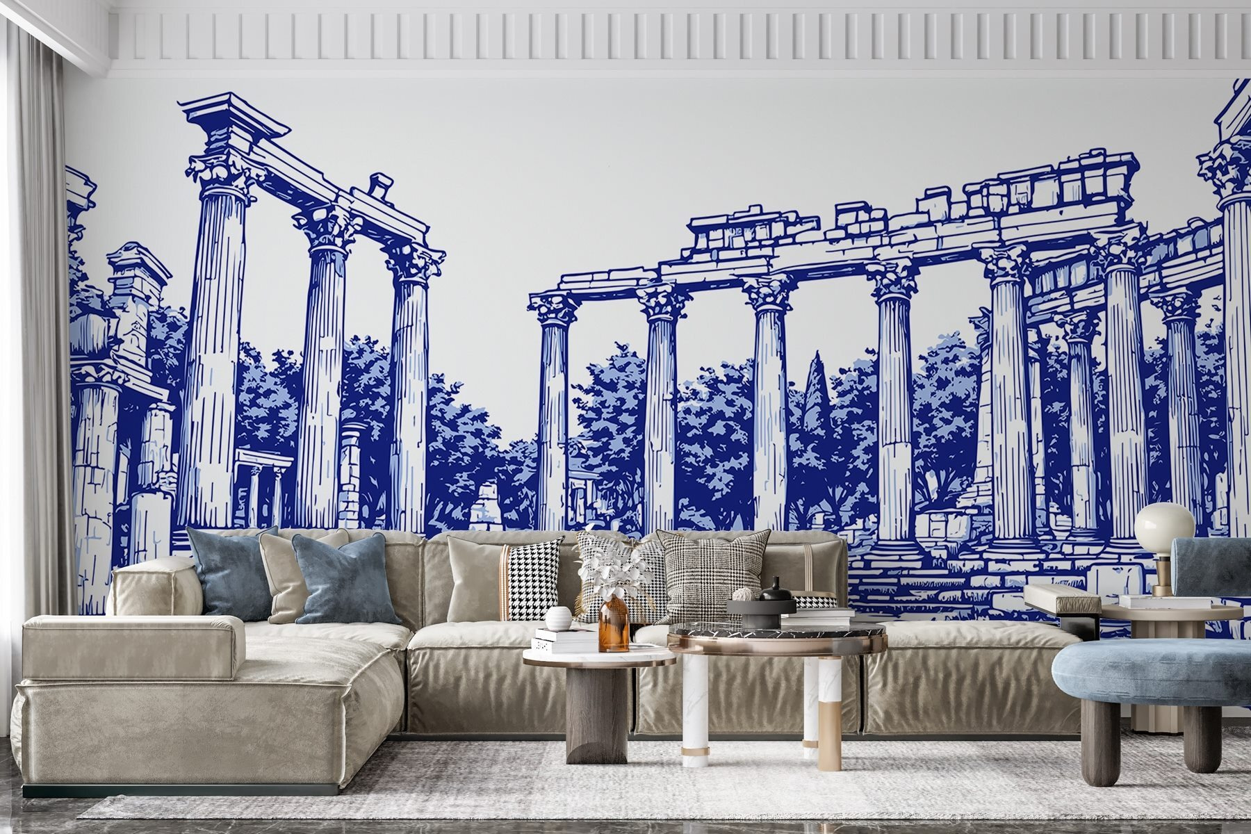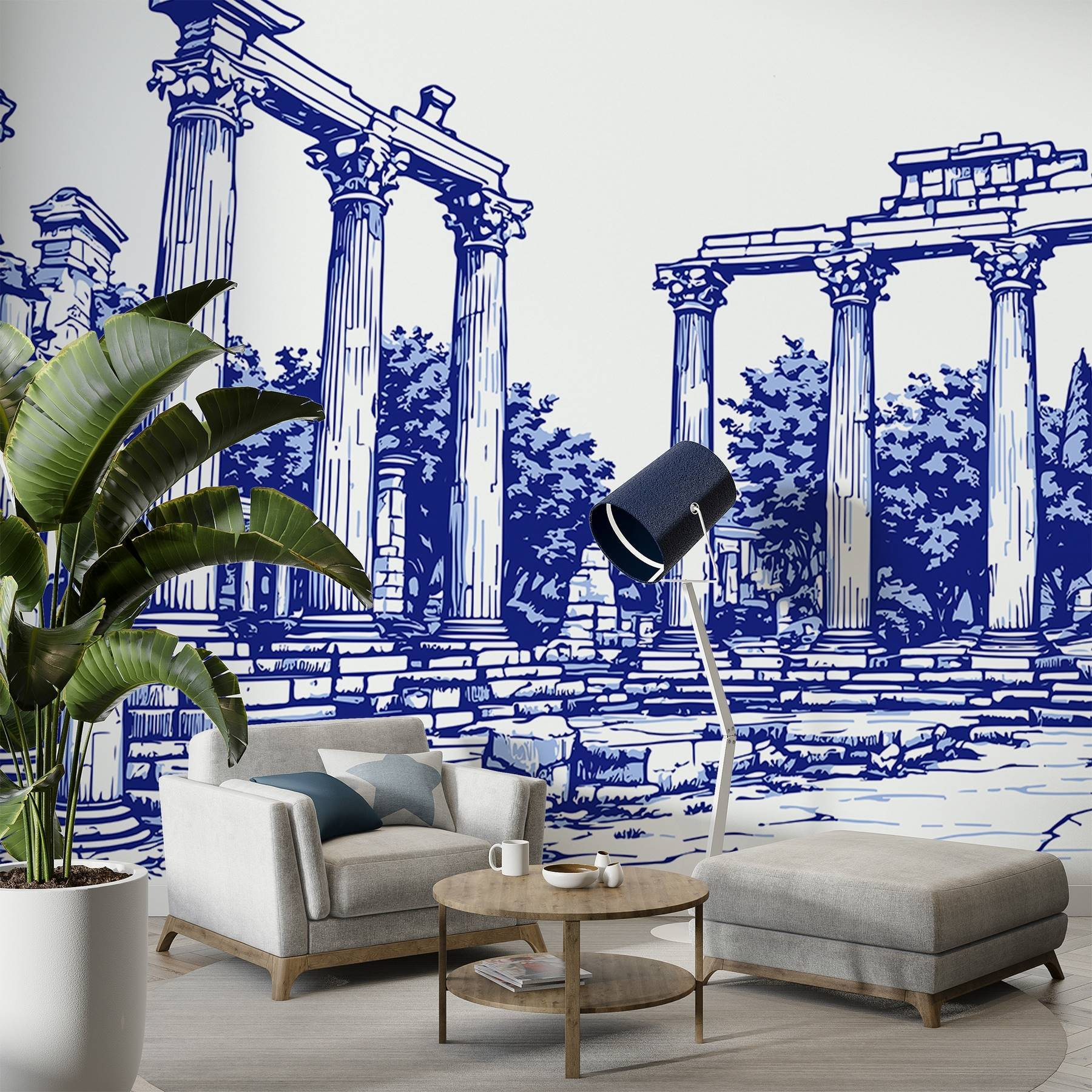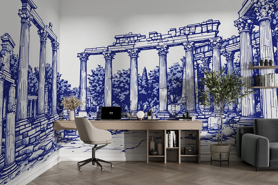 Stap in een wereld van oude charme met deze prachtige muurschildering met een fascinerende stenen structuur versierd met elegante zuilen. Stel je voor dat je je kamer binnenloopt en meteen wordt meegevoerd naar een serene Griekse ruïne, waar het zonlicht door weelderige bomen valt. De rijke details en mooie lijnen nodigen uit tot dagdromen over betoverende geschiedenis en epische verhalen. Het is alsof je een stukje natuur en traditie uitnodigt in je alledaagse ruimte. Deze muurschildering is perfect voor die lege muur en voegt warmte en karakter toe – ideaal voor gezellige avonden of pittige bijeenkomsten. Laat je muren een uniek verhaal vertellen dat tot de verbeelding spreekt!