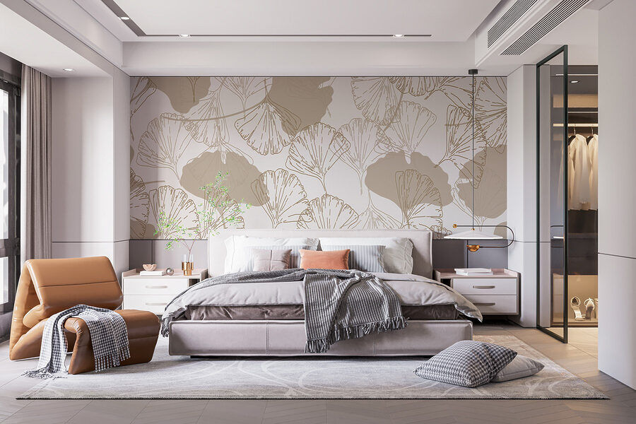 Stel je eens voor dat je een kamer binnenstapt waar de muren fluisteren van de natuur en een luchtig gevoel uitstralen dat gewoonweg verrukkelijk is. Deze muurschildering, met een speels patroon van bladeren tegen een zacht witte achtergrond, creëert een serene sfeer, als een zacht briesje dat door de bomen ruist. Het is alsof je je ruimte omtovert in een klein bosachtig toevluchtsoord.