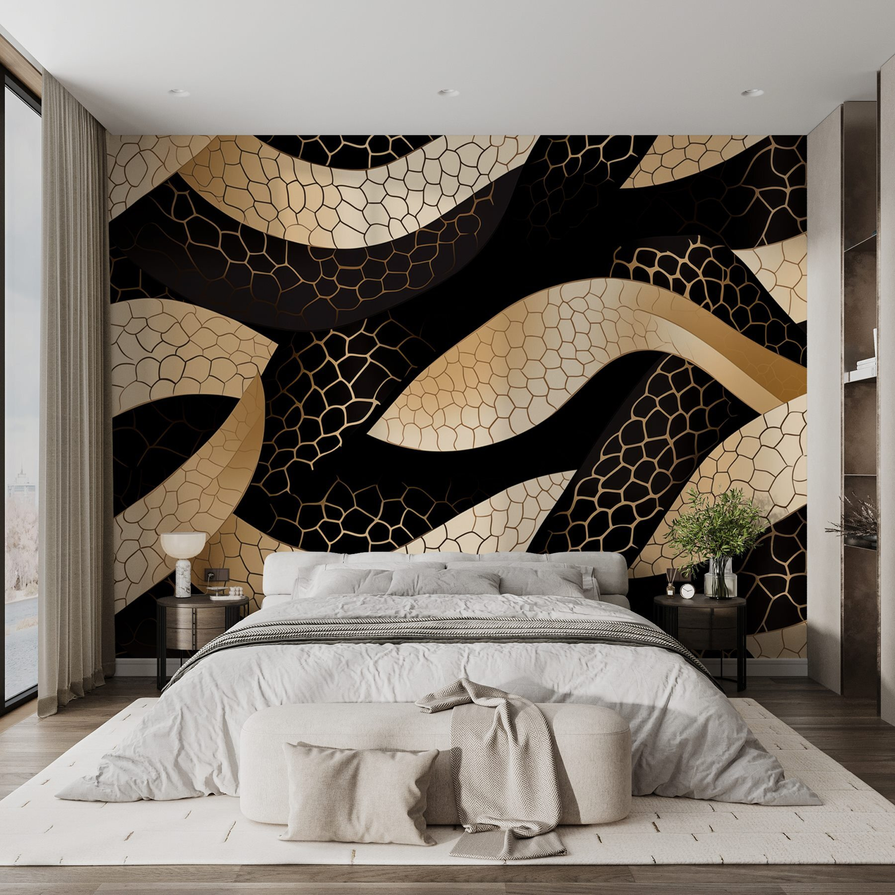 Breng een vleugje elegantie in elke kamer met deze betoverende muurschildering met sierlijke golven die dansen tegen een donkere achtergrond. Het is alsof je een kunstwerk aan je muur hangt, dat je ruimte onmiddellijk omtovert in iets buitengewoons. Stel je gezellige avonden voor die je doorbrengt met het bewonderen van de manier waarop het licht op die rondingen valt, of hoe ze zachtjes lijken te kabbelen als je voorbij loopt. Vrienden zullen onvermijdelijk complimenten geven over je “chique” inrichting, terwijl je diep van binnen weet dat je gewoon helemaal stijlvol bent. Deze muurschildering is perfect voor woonkamers, slaapkamers of zelfs dat eigenzinnige kantoor aan huis en nodigt uit tot warmte en charme, waardoor elke blik een beetje specialer wordt. Het is kunst, het is decor, het is bijna een conversatie starter. Wie wist dat muren zo mooi konden zijn?