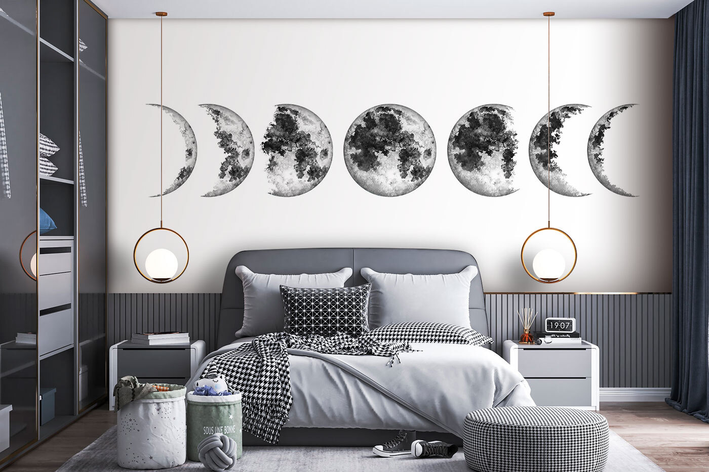 Transformeer een kamer met de fascinerende muurschildering “Row of Phases of the Moon”. Het is alsof je een nachtelijke hemel in huis hebt, met een kalme sfeer die perfect is voor kinderen en iedereen die jong van hart is. Stel je die zachte maansikkels voor die ‘s nachts over dromers waken en nieuwsgierig maken naar de kosmos – wie houdt er niet van een beetje magie met sterrenlicht? Het is een geweldige gespreksstarter en perfect voor speel- of slaapkamers. Bovendien geeft het muren een dromerige twist, perfect om kleintjes tot avontuur aan te zetten. Prikkel je verbeelding en laat de maan hun gids zijn!
