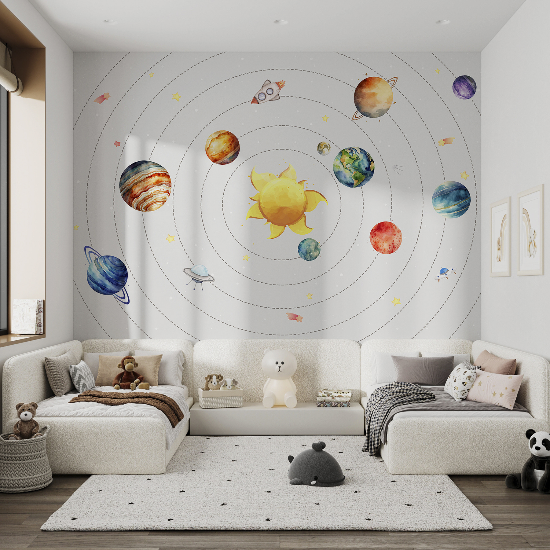 Verander elke ruimte in een kosmisch wonderland met deze levendige muurschildering. Met een speelse aquarelafbeelding van ons zonnestelsel nodigt het kleine dromers uit om avonturen tussen de sterren te bedenken. De vrolijke zon, kleurrijke planeten en het grillige ruimteschip prikkelen de nieuwsgierigheid en creativiteit. Stel je een gezellige leeshoek voor of een slaapkamer waar het sterrenstelsel slechts een blik verwijderd is. Het is alsof je een stukje ruimte aan de muur hebt hangen, klaar om die grote dromen te inspireren. Wie weet? Misschien is je kind op een dag de volgende ruimteverkenner!