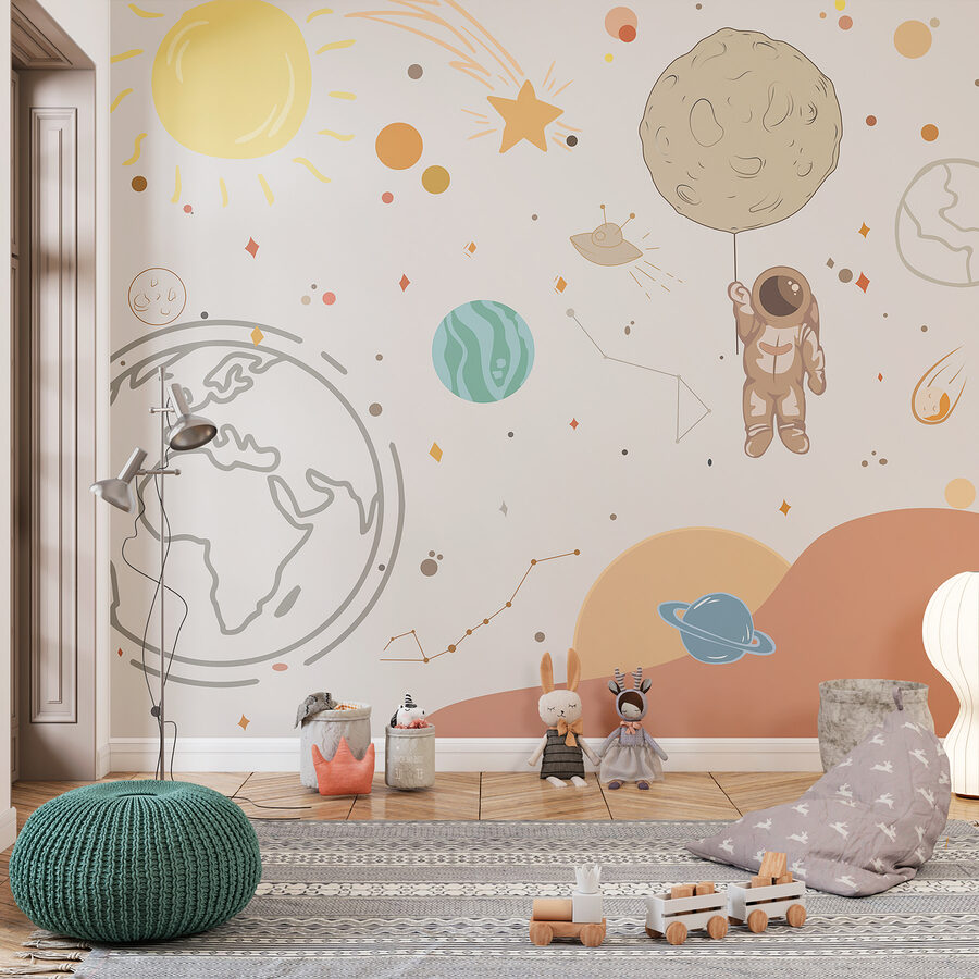 Stel je voor dat je naar een dromerig, grillig universum staart zonder je woonkamer te verlaten. Deze “Fotobehang Cartoon of a planet” is perfect voor iedereen met een liefde voor het heelal en een zwak voor schattige astronautenkunst. Het ontwerp is speels en zit vol met planeten, sterren en zelfs een vrolijke kleine ruimtereiziger die een maanachtige ballon vasthoudt. Perfect om een kinderkamer mee op te vrolijken of om een beetje kosmische charme aan elke ruimte toe te voegen. Het is niet alleen een muurschildering, het is een hele sfeer. Het voelt alsof je door een zacht, cartoonesk sterrenstelsel zweeft.
