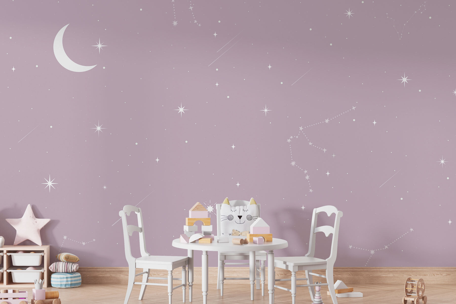 Verander uw ruimte in een dromerige toevluchtsoord met de muurschildering “Moon and Stars in a Sky”. Stel u voor dat u lekker onder een dekentje zit, thee drinkt en naar een rustige nachtelijke hemel staart, allemaal vanuit het comfort van uw woonkamer. Het is alsof u een beetje sterrenlicht op uw muren heeft! De zachte tinten en elegante sterrenbeelden nodigen uit tot rust, waardoor het perfect is om te ontspannen na een lange dag of om creativiteit te inspireren. En wie houdt er nou niet van een beetje hemelse charme? Geweldig voor slaapkamers, kinderkamers of elke andere ruimte die wel een vleugje magie kan gebruiken. Het is niet alleen decoratie, het is een ticket naar een sterrennacht – zonder muggen!
