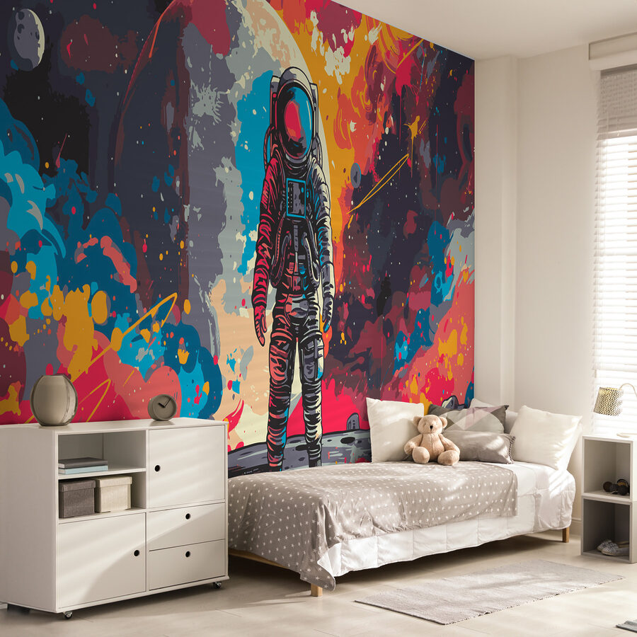 Stel je een astronaut voor, recht uit je wildste ruimtedromen, staand tegen een explosie van interstellaire landschappen. Het is net een kosmisch dansfeest elke keer dat je er naar kijkt! Perfect voor iedereen die een element van verwondering en grenzeloze mogelijkheden aan zijn kamer wil toevoegen. Kinderen, volwassenen, iedereen zal verdwalen in de betoverende galaxy vibes. Het is het soort muurschildering dat je aan het denken zet, laat dromen en misschien zelfs een reis naar de sterren laat plannen!