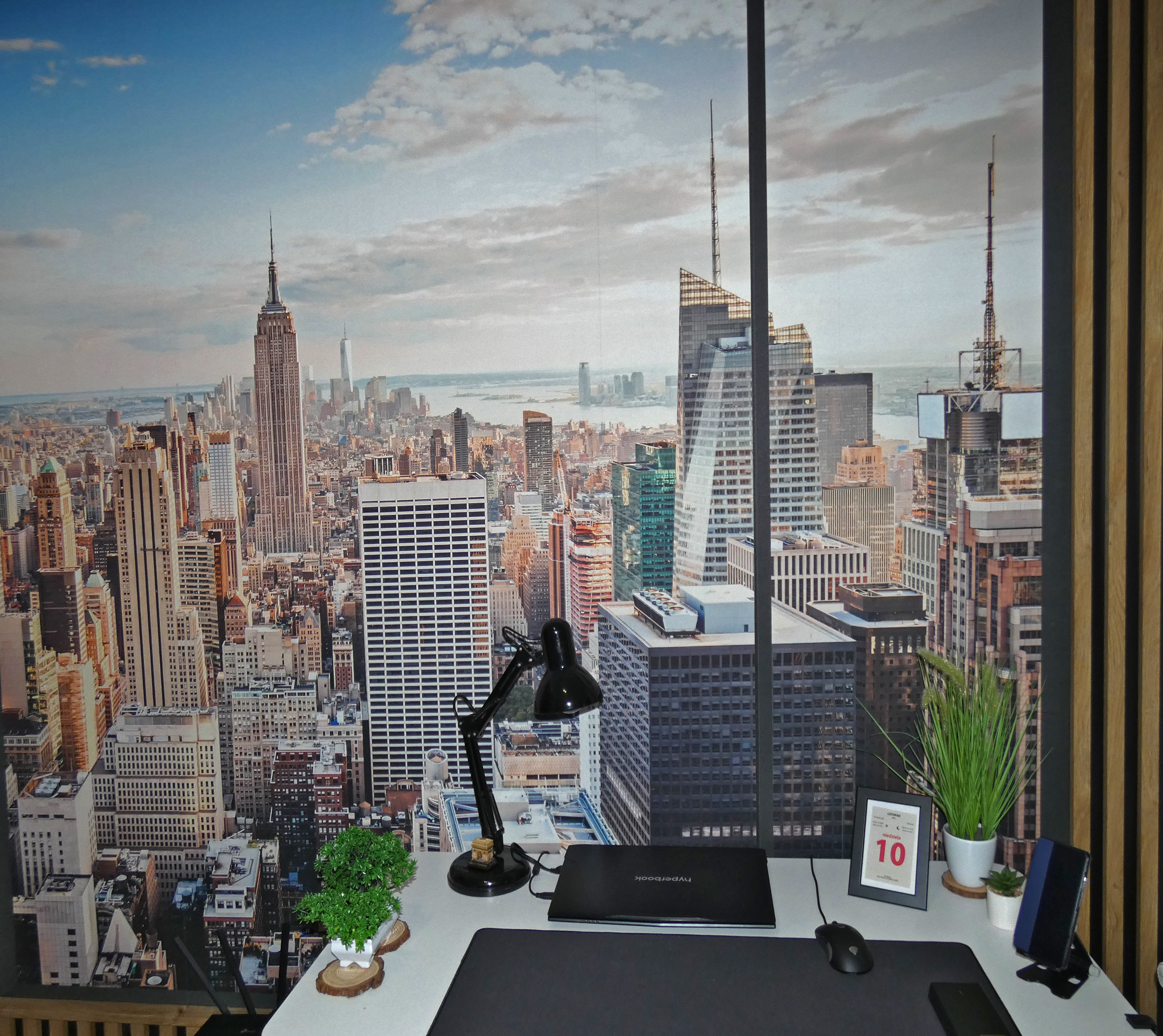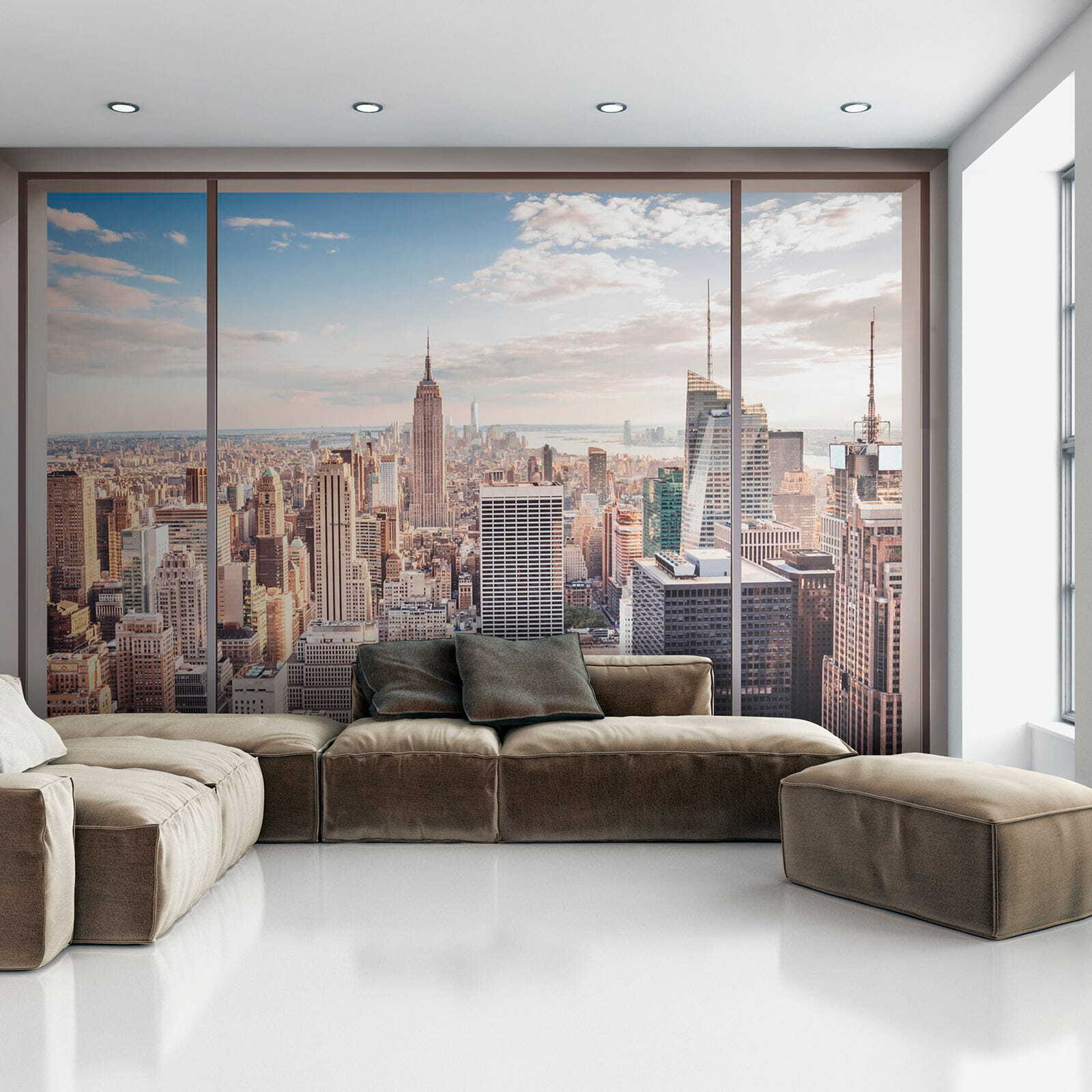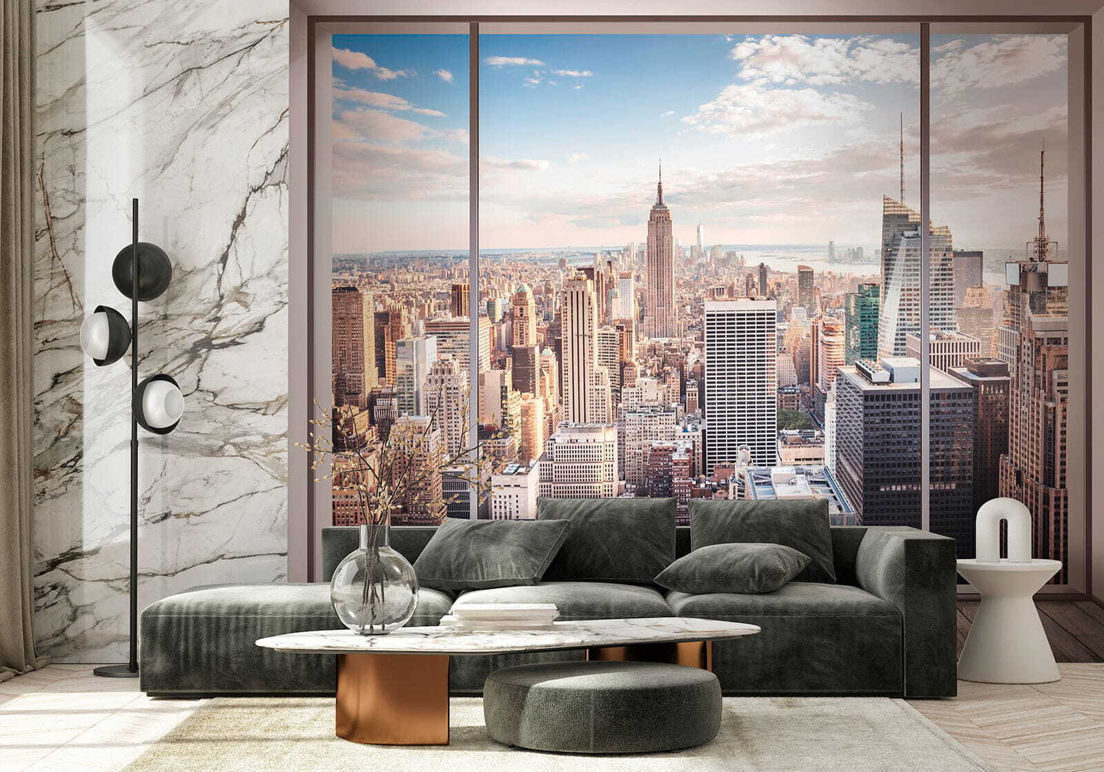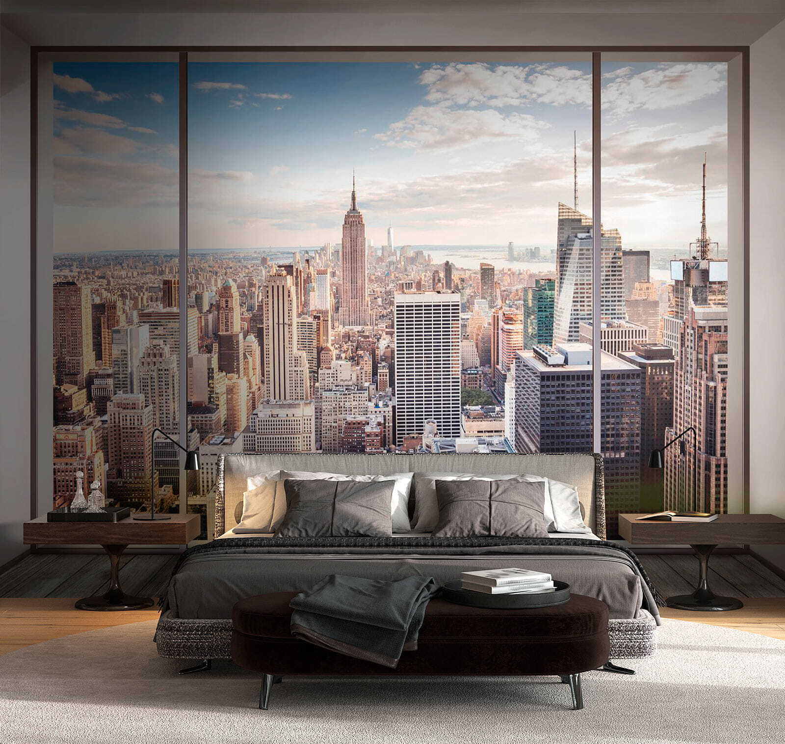 Stel je voor dat je elke dag wakker wordt met deze epische skyline zonder dat je je kamer hoeft te verlaten! “Fotobehang Skyline view through large window” geeft je dat grootstedelijke gevoel, zonder de drukte. Perfect voor iedereen die droomt van het stadsleven of gewoon houdt van een geweldig uitzicht. Het is alsof je een penthouse in je woonkamer hebt. Plus, geen lawaai!