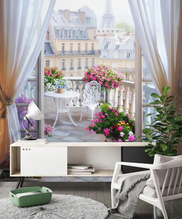 Stel je voor dat je je woonkamer binnenstapt en wordt meegevoerd naar een sereen balkon in Parijs-ah, de charme! Deze muurschildering “Serene Parisian Balcony with Flowers” tovert je ruimte moeiteloos om in een chique, Europese ontsnapping. Stel je voor: fijne smeedijzeren stoelen, levendige bloemen die over potten uitlopen en de Eiffeltoren die door het zachte zonlicht glinstert. Het is net een instant vakantie, zonder het inpakken.