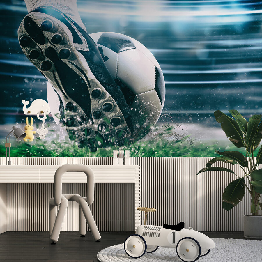Of je nu een voetballiefhebber bent of gewoon op zoek bent naar iets cools en dynamisch om je ruimte mee op te fleuren, deze muurschildering is een fantastische keuze.