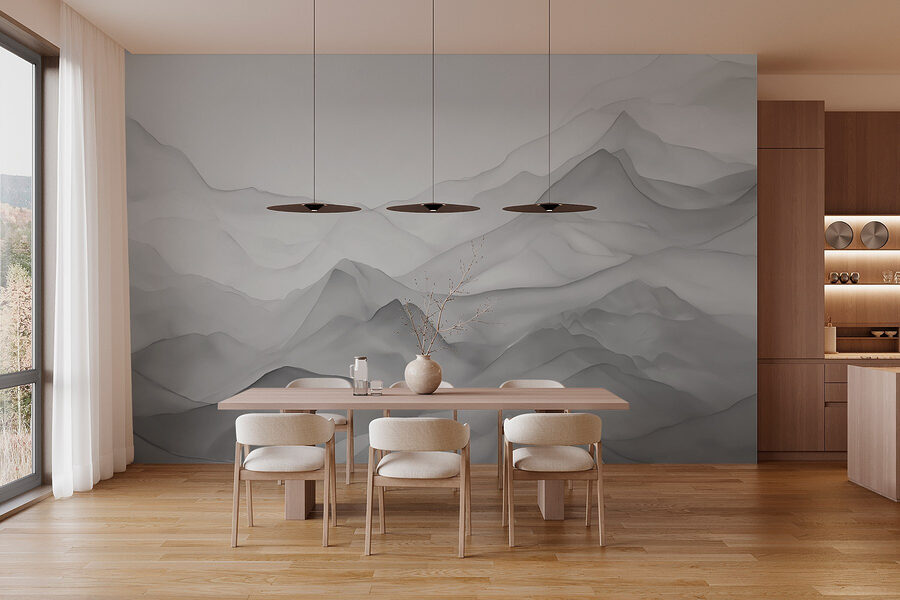 Transformeer je ruimte met deze muurschildering die elegantie en avontuur uitstraalt. Stel je voor dat je een kamer binnenloopt en het gevoel hebt dat je een serene bergketen bent binnengestapt, waar grijze en witte tinten zich zachtjes vermengen. Het is perfect voor het creëren van een relaxte sfeer, of het nu voor een tienerkamer of een gezellige leeshoek is. De zachte kleurverlopen zorgen voor een dynamisch maar rustgevend gevoel, een beetje zoals een stille ochtendmist over verre bergtoppen. Stel je voor: het ene moment zit je naar de muur te staren en het volgende moment ben je verdwaald in dagdromen over verre oorden. Het nodigt uit tot ontspanning, nietwaar? Een stukje natuur zonder de wandeling!