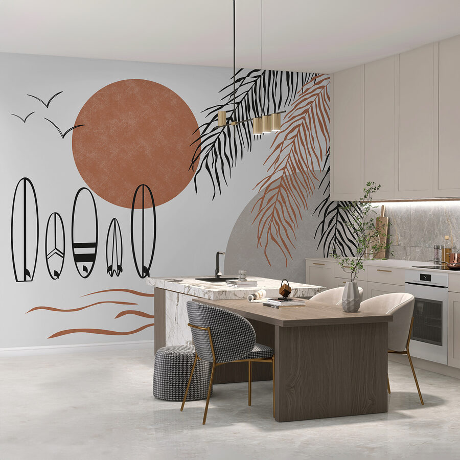 De zachte kleuren en palmboomsilhouetten… ze voelen precies goed om een rustige, maar speelse ruimte te creëren. Zie jezelf al ontspannen met een goed boek, met het denkbeeldige geluid van golven op de achtergrond. Deze muurschildering is niet zomaar decoratie; het is een uitnodiging om tot rust te komen. En die vogels? Ze lijken bijna klaar om kleine geheimen van de oceaan in je oor te fluisteren!