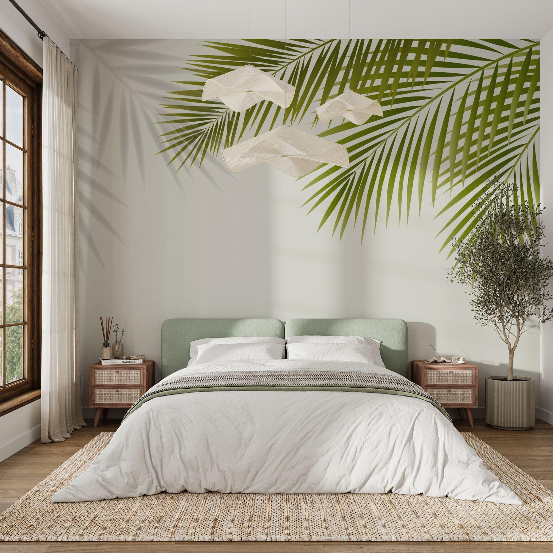Verander elke kamer in een verfrissende ontsnapping met deze muurschildering met weelderige groene bladeren op een zacht witte achtergrond. Het voelt als een instant ontsnapping, perfect voor degenen die hunkeren naar een stukje natuur zonder het gedoe van planten water geven. Stel je voor dat je wakker wordt met dit levendige tafereel. Het is alsof je een tropische oase aan je muur hebt hangen. Of het nu in een gezellige woonkamer is of in een luchtige slaapkamer, de bladeren wuiven hallo alsof ze je uitnodigen om achterover te leunen en te ontspannen. Deze muurschildering is ideaal voor natuurliefhebbers en geeft een serene sfeer en een vleugje leven. Perfect voor een hoekje of een opvallende muur, het is een gemakkelijke manier om wat frisse lucht in je interieur te blazen, geen palmbomen nodig.