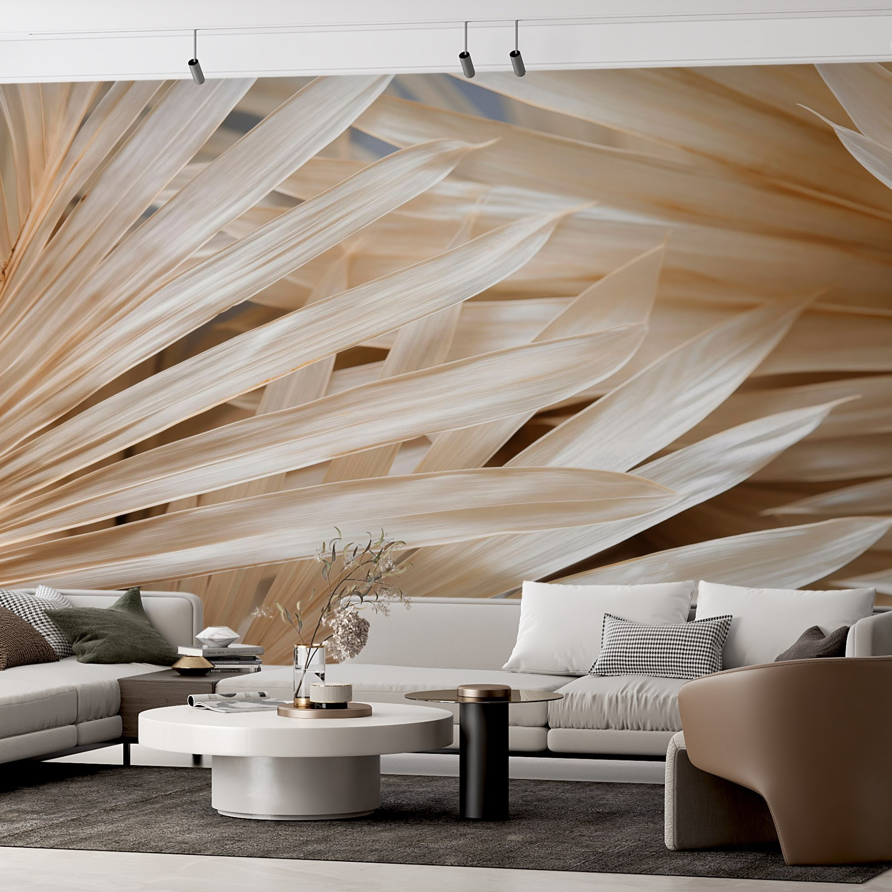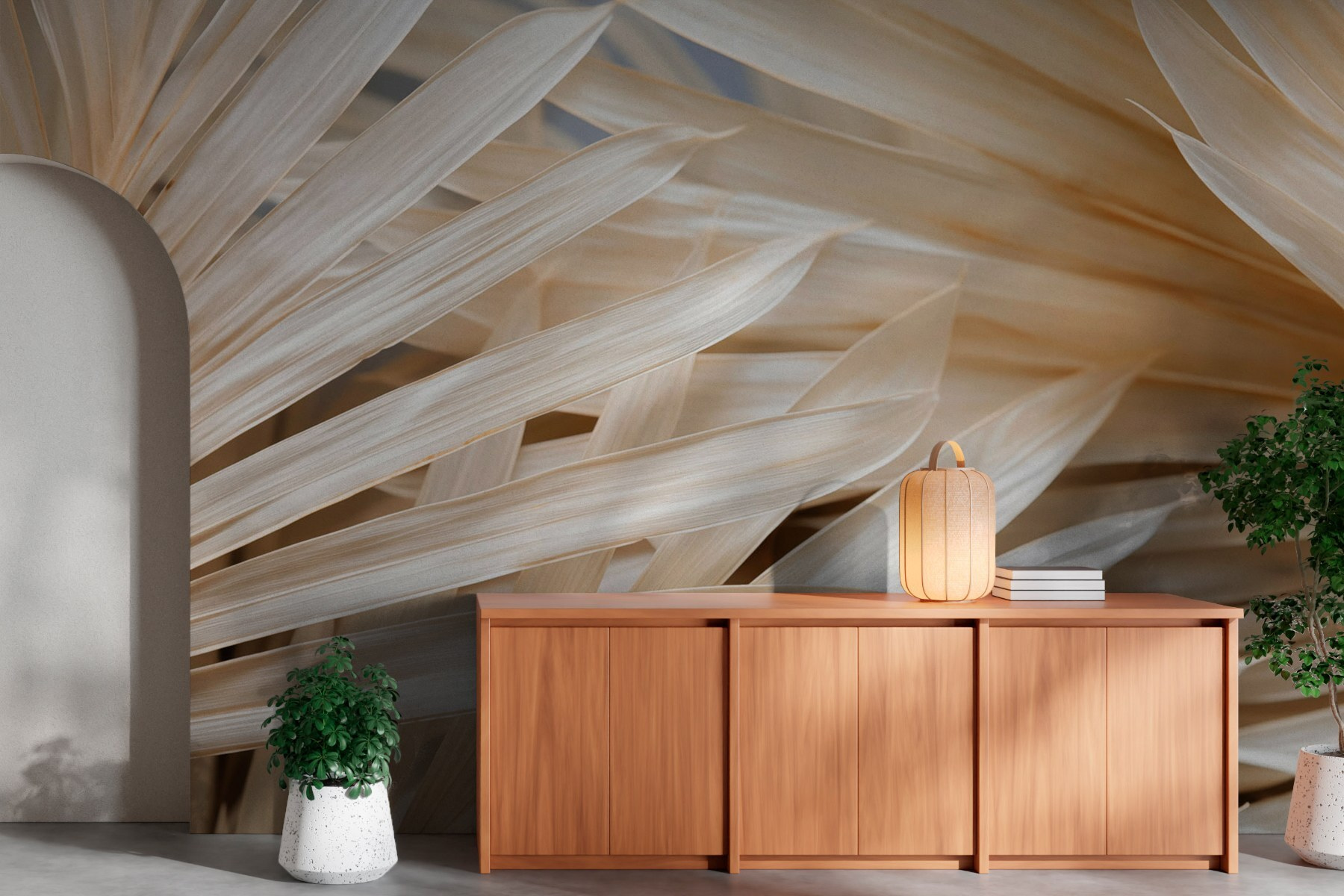 Verander uw ruimte in een rustig toevluchtsoord met de muurschildering ‘Natural Elegance of Palm Leaves’. Stel u voor dat u elke keer dat u de kamer binnenkomt, een rustgevende oase binnenstapt. Die zachte, golvende palmbladeren brengen die tropische sfeer rechtstreeks naar uw muren – perfect om een vleugje natuur toe te voegen zonder dat u zich zorgen hoeft te maken over het water geven van planten!