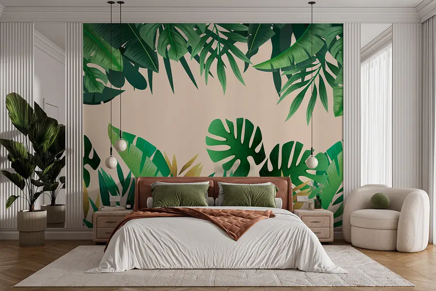 Verander elke kamer in een tropische ontsnapping met deze levendige muurschildering van groene bladeren. Stel je voor dat je binnenkomt en het gevoel hebt dat je een weelderig regenwoud bent binnengestapt – de eigen luchtzuiverende magie van de natuur thuis. Het rijke groen en de speelse patronen zijn als een frisse wind, waardoor zelfs een kleine ruimte open en levendig aanvoelt. Perfect voor een gezellig leeshoekje of een funky keukenmuur, het is precies wat je nodig hebt om een gesprek op gang te brengen. Vrienden zullen zich afvragen of er een avontuur in de jungle om de hoek ligt. Wie heeft er vakantie nodig als je dit hebt?
