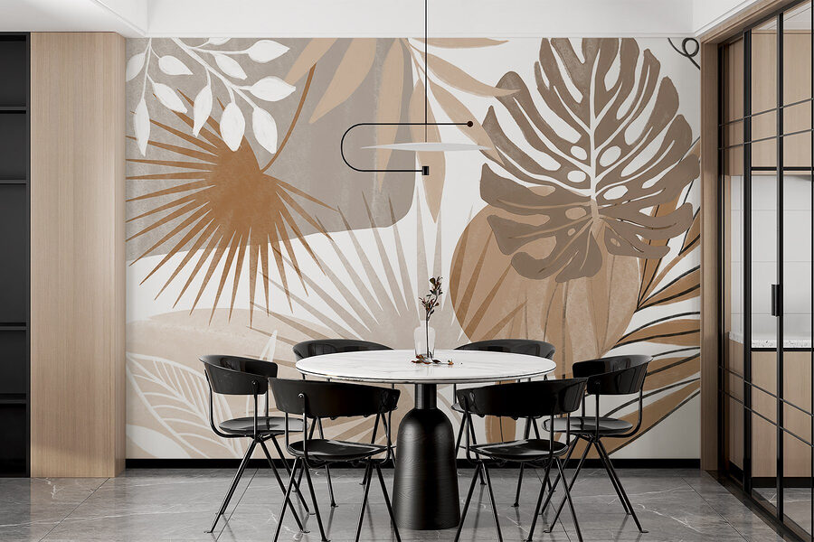 Transformeer je kamer met deze fascinerende muurschildering met een abstract ontwerp geïnspireerd op de natuur. Stel je voor dat je je kamer binnenstapt en begroet wordt door een prachtige uitbarsting van aardetinten en sierlijk gebladerte. Het is alsof je een stukje tropische oase in huis haalt.