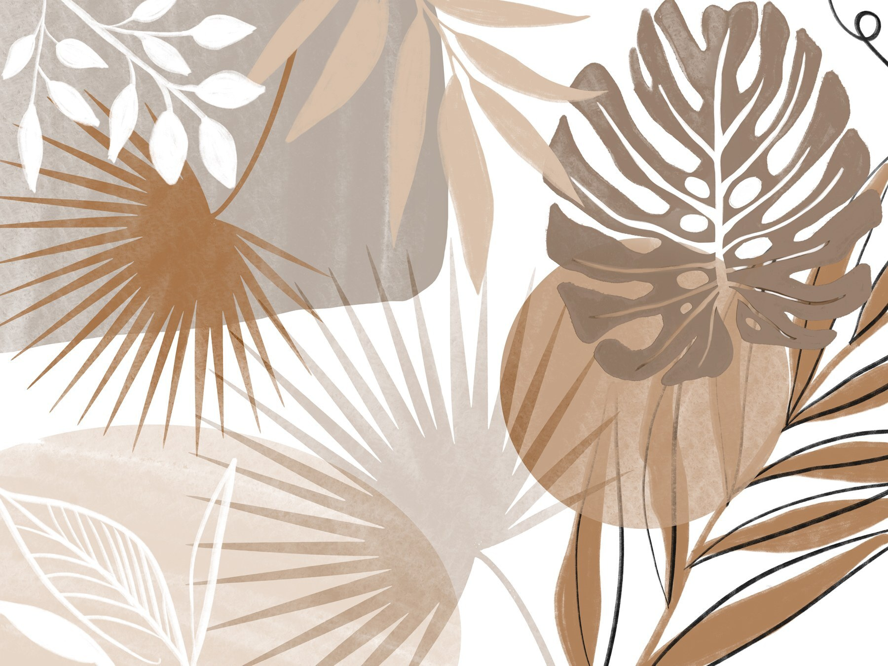 Transformeer je kamer met deze fascinerende muurschildering met een abstract ontwerp geïnspireerd op de natuur. Stel je voor dat je je kamer binnenstapt en begroet wordt door een prachtige uitbarsting van aardetinten en sierlijk gebladerte. Het is alsof je een stukje tropische oase in huis haalt.