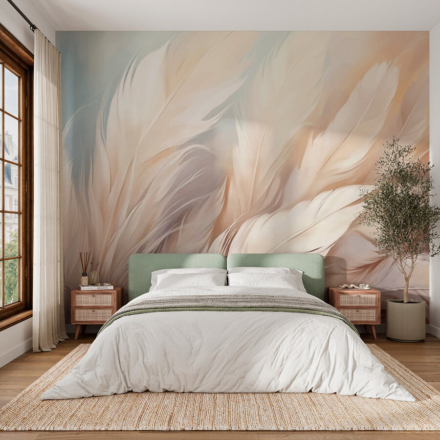 Stel je voor dat je een kamer binnenloopt en het gevoel hebt dat je zachtjes omhelsd wordt door een wolk. Dat is wat deze muurschildering “Soft Feathers in Serene Hues” doet. Het is als een rustgevende fluistering op je muren, met die delicate veren die dansen in rustige tinten. Perfect om tot rust te komen na een lange dag – het is een soort yoga voor je kamer. Zachte blauw- en crèmetinten die aanvoelen als een slaapliedje voor je ziel! Zet het in je woon- of slaapkamer; het heeft die rustgevende vibe waar iedereen naar verlangt. Bovendien hoeft hij nooit te worden afgestoft.