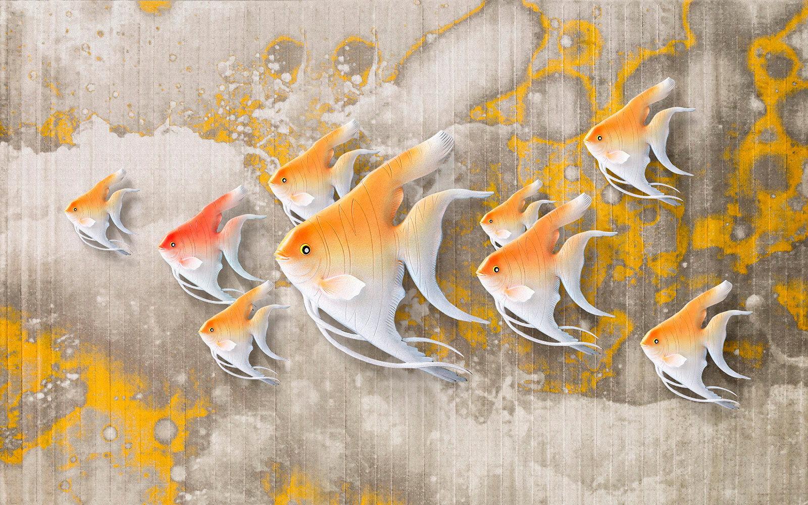Tover je ruimte om in een serene onderwaterwereld met deze betoverende muurschildering met kleurrijke vissen die in formatie zwemmen. Stel je voor dat je een kamer binnenstapt waar deze levendige wezens over de muur lijken te dansen en leven en energie brengen in je omgeving. De speelse kleuren knallen tegen een gestructureerde achtergrond en creëren een gevoel van beweging dat de aandacht trekt. Deze muurschildering is perfect voor een verblijf aan zee of zelfs een gezellig leeshoekje, en neemt je mee weg van de alledaagse drukte. Je zult het gevoel hebben dat je in een serene oceaan kijkt, met een zachte golf van kalmte die over je heen spoelt. Het is zeker een gespreksstof en wie weet roept het een verlangen op naar die strandvakantie! Perfect voor visliefhebbers of mensen die gewoon een vleugje kleur willen toevoegen, deze muurschildering nodigt vreugde uit in het dagelijks leven.