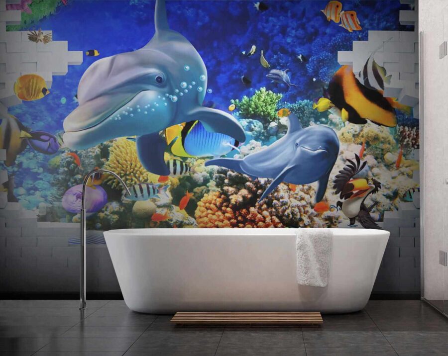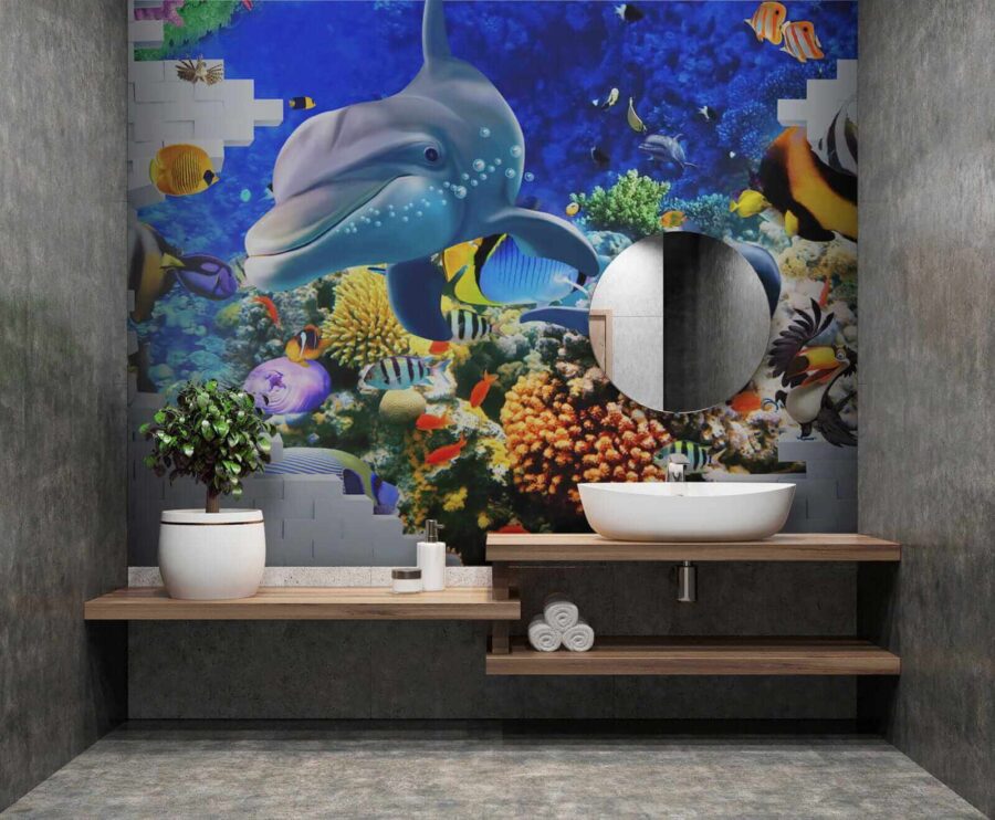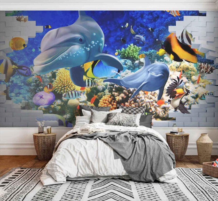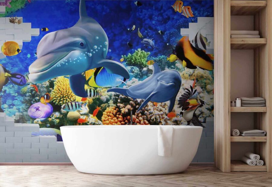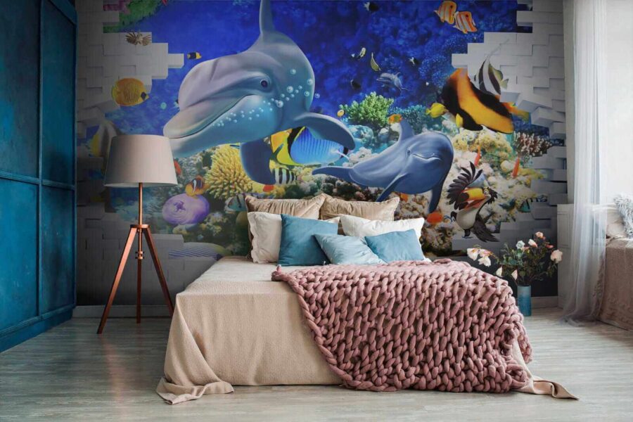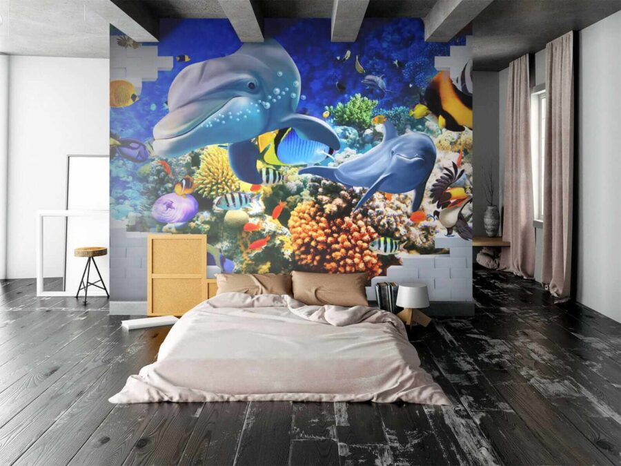 Duik in een levendige onderwaterwereld met deze muurschildering van vissen en speelse dolfijnen, die een vleugje zee in je huis brengen. Stel je voor dat je je kamer binnenstapt en de rustgevende sfeer van de oceaan over je heen voelt komen. Heldere kleuren dansen om je heen – van brutale clownvissen tot slanke dolfijnen die hun mooiste glimlach laten zien. Het is meer dan alleen decoratie; het is alsof je een stukje van de diepblauwe zee binnen handbereik hebt. Perfect voor een kinderkamer, een gezellige studeerkamer of elke andere ruimte die wel een vrolijke noot kan gebruiken. Eerlijk gezegd, wie zou er nu geen dolfijn als kamergenoot willen? Laat deze muurschildering je dagelijks herinneren aan de wonderen van de oceaan, maar dan zonder wetsuit!