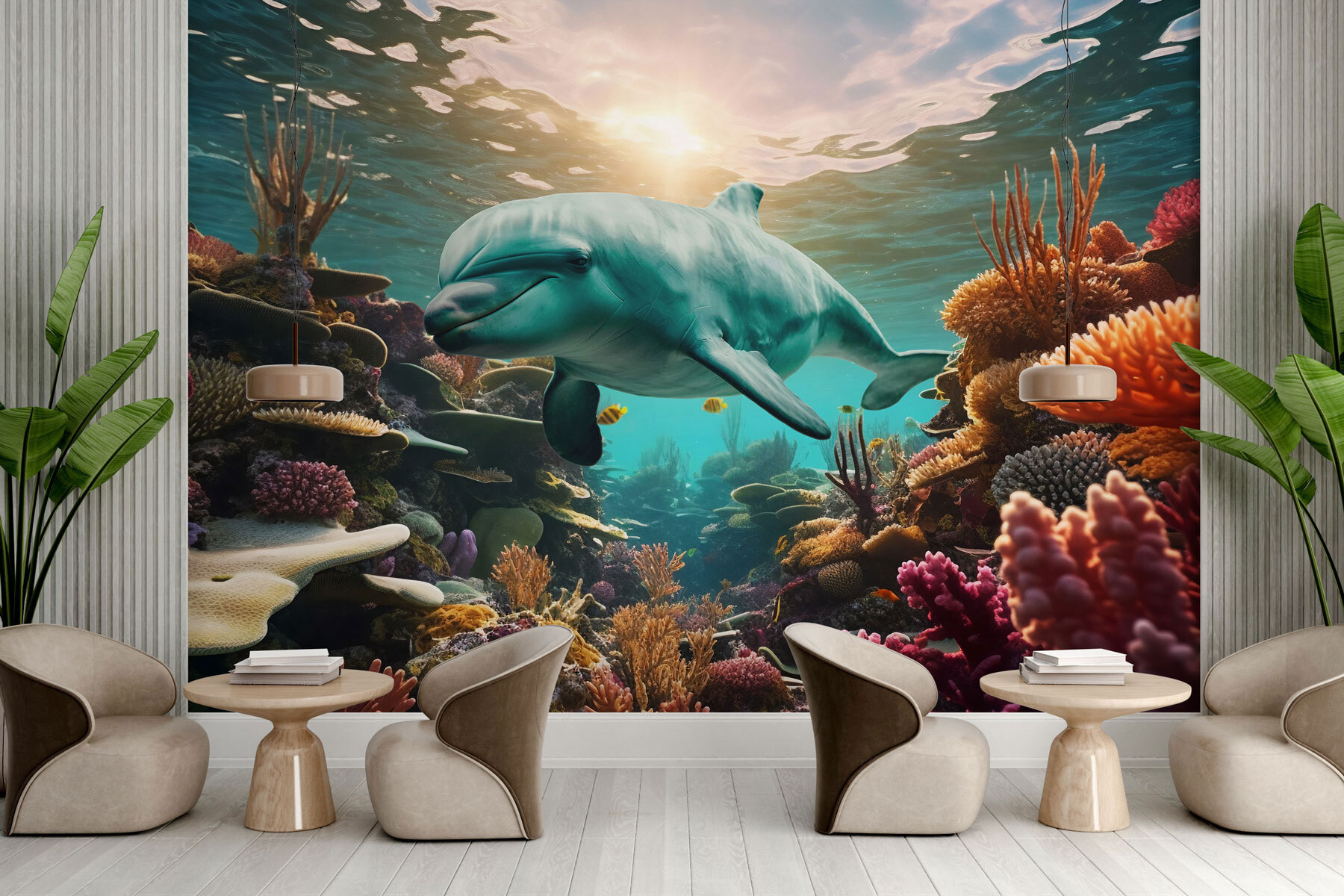 Duik in een vleugje sereniteit met deze muurschildering van een dolfijn die sereen rondzwemt in een levendige oceaan. Stel je voor: je muren worden omgetoverd tot een dromerige onderwaterwereld vol kleurrijk koraal en vrolijke vissen. Het is alsof je een raam hebt naar een heldere, vredige oceaan in je huis. Vrienden zullen zeker stoppen en staren, zich afvragend of ze een aquarium zijn binnengestapt. Stel je voor dat je wakker wordt met dit prachtige tafereel en je elke dag een beetje meer ontspannen voelt. Het is niet zomaar een decor; het is een dagelijks avontuur. Deze muurschildering is perfect om een luchtige sfeer aan zee toe te voegen en brengt zonneschijn en vreugde in elke ruimte!