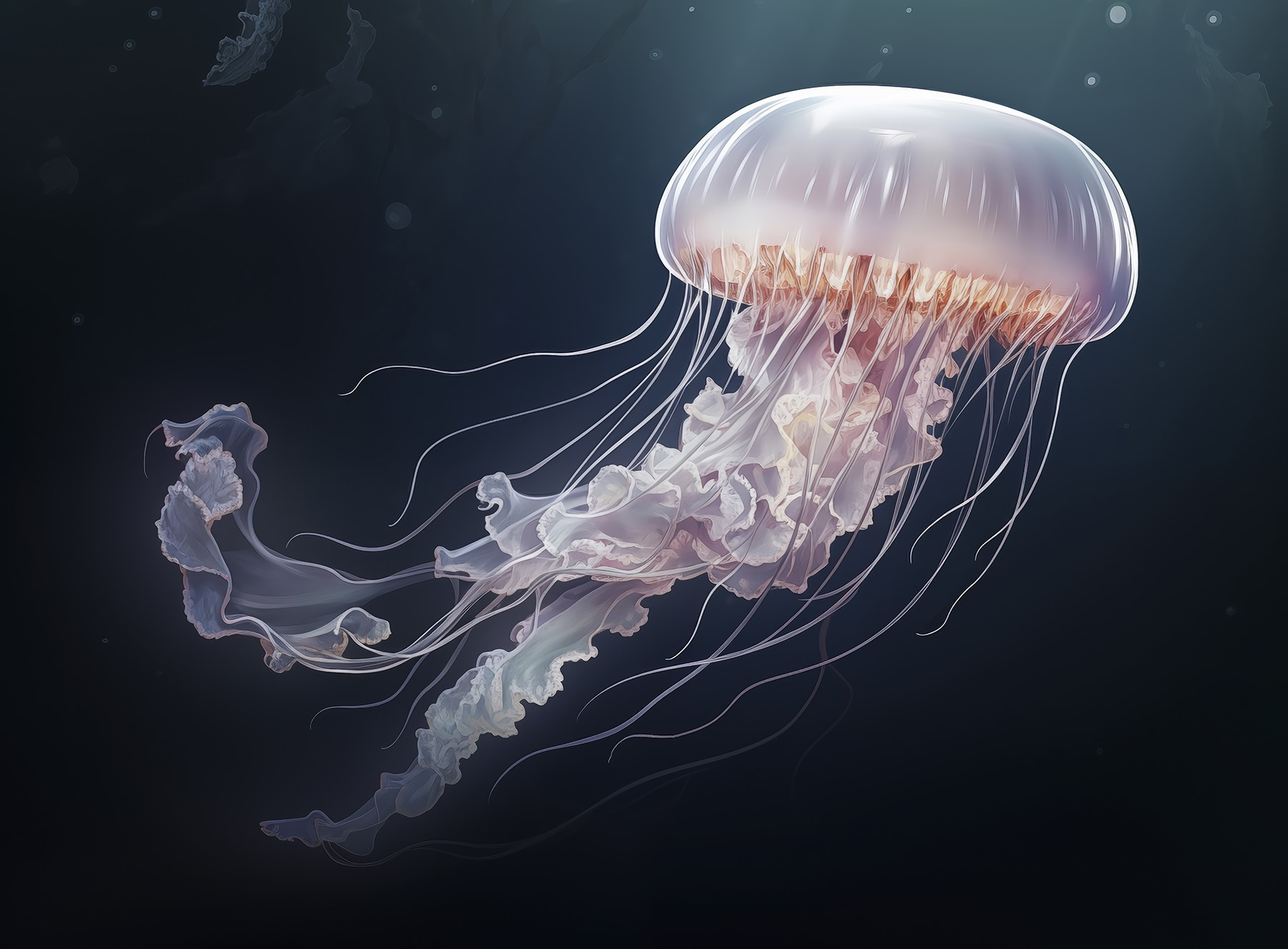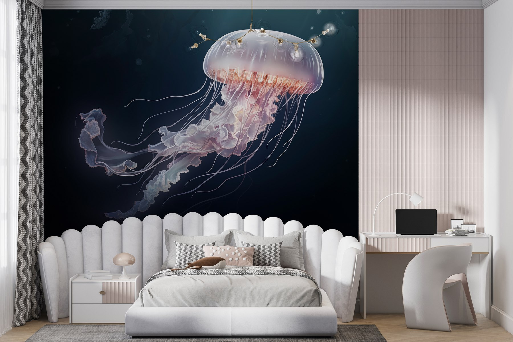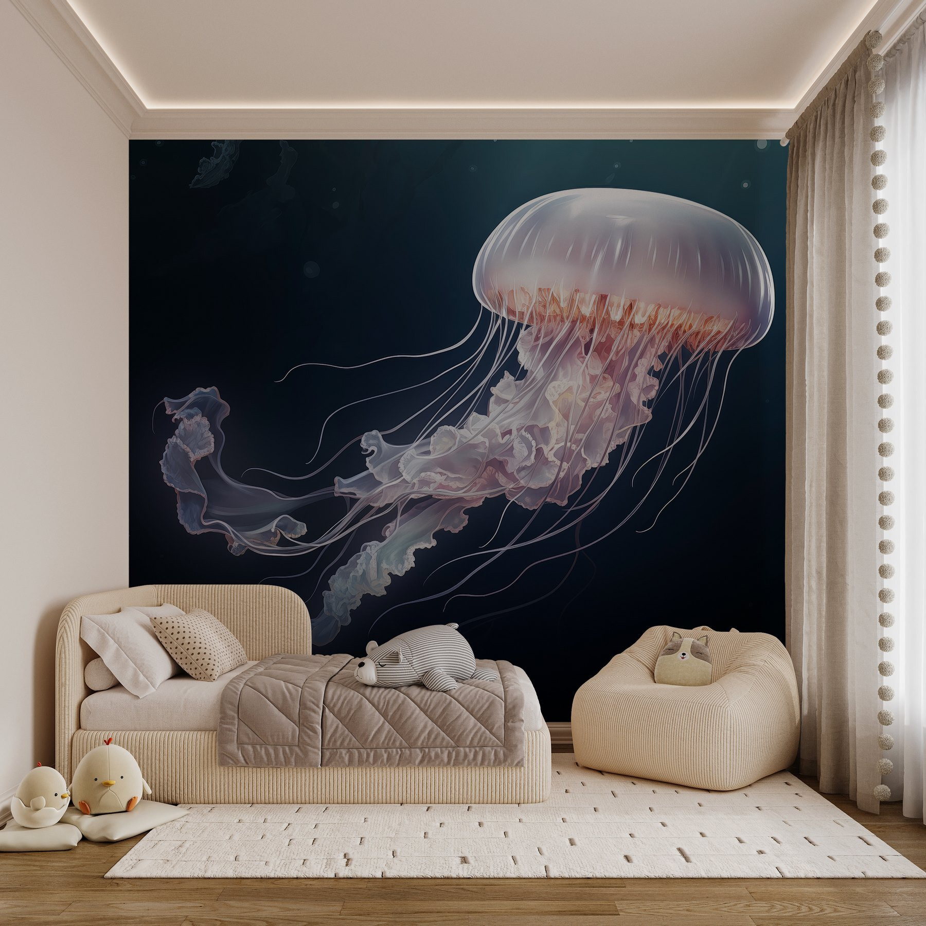 Duik in een zee van rust met deze prachtige muurschildering van kwallen. Zie het al hangen in een gezellig hoekje of in je woonkamer, met een rustgevende sfeer die iedereen doet denken aan luie stranddagen. De kleuren vloeien als oceaangolven en geven subtiel dat dromerige onderwatergevoel weer. Stel je voor dat vrienden met wijd opengesperde ogen stilstaan en zich verbazen over de delicate gratie. Deze muurschildering versiert niet alleen een muur, maar neemt je mee naar een serene onderwaterwereld. Het is alsof je een stukje oceaan bij je thuis hebt – perfect om te dagdromen of om je volgende vakantie aan zee te plannen. Wie wist dat de oceaan er zo mooi uit kon zien?