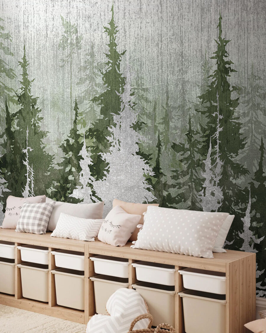 Transformeer je ruimte met deze betoverende muurschildering van een bos, waar bomen geheimen lijken te fluisteren in de wind. Het is alsof je een serene boswandeling maakt zonder je woonkamer te verlaten. Stel je gezellige avonden voor met een kopje thee terwijl je naar het rustige groen en de zachte grijstinten staart. De lagen bomen creëren diepte, bijna als een dromerige ontsnapping aan het dagelijks leven. Perfect voor iedereen die de schoonheid van de natuur in huis wil halen. Deze muurschildering versiert niet alleen een muur, maar brengt leven in elke kamer. Misschien vraag je je wel af of er een eekhoorn voorbij komt scharrelen!