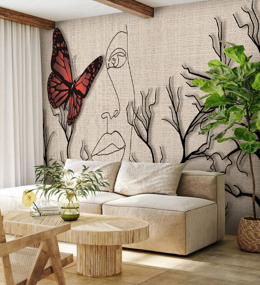 Transformeer uw ruimte met deze prachtige muurschildering met een vlinder die danst naast het gezicht van een vrouw, omringd door delicate takken. Het is niet alleen kunst, het is een statement – alsof u een serene moment op uw muur hebt vastgelegd. Stelt u zich eens voor dat u elke dag wakker wordt met deze schoonheid; de levendige vlinder brengt een vleugje leven, terwijl de zachte uitdrukkingen een gevoel van rust oproepen. Perfect voor een gezellige woonkamer of een creatieve hoek, het nodigt uit tot nieuwsgierigheid en conversatie. En wie houdt er nou niet van vlinders? Ze zijn als kleine kunstenaars van de natuur, die charme en fantasie toevoegen. Omarm een sfeer die uniek van jou is!