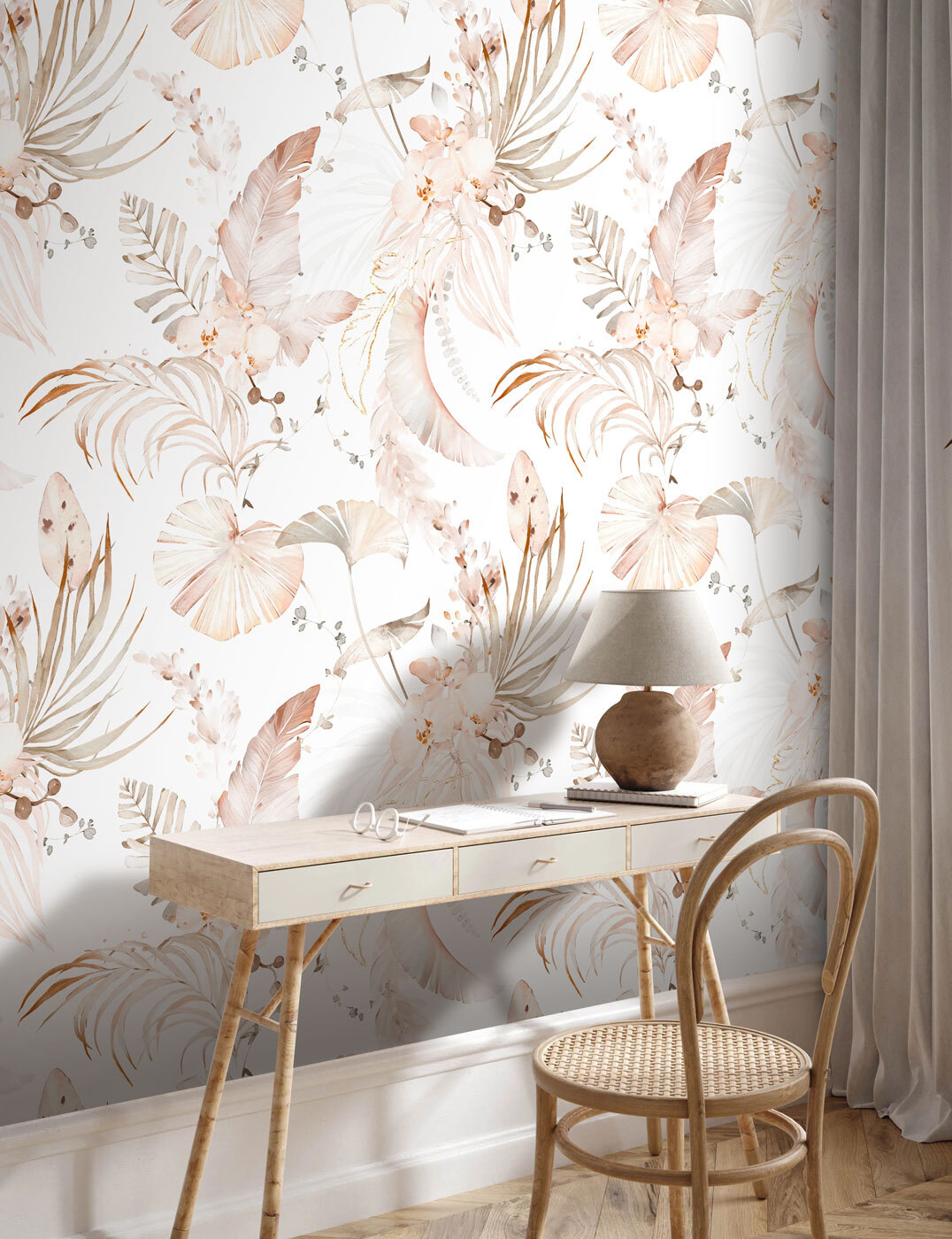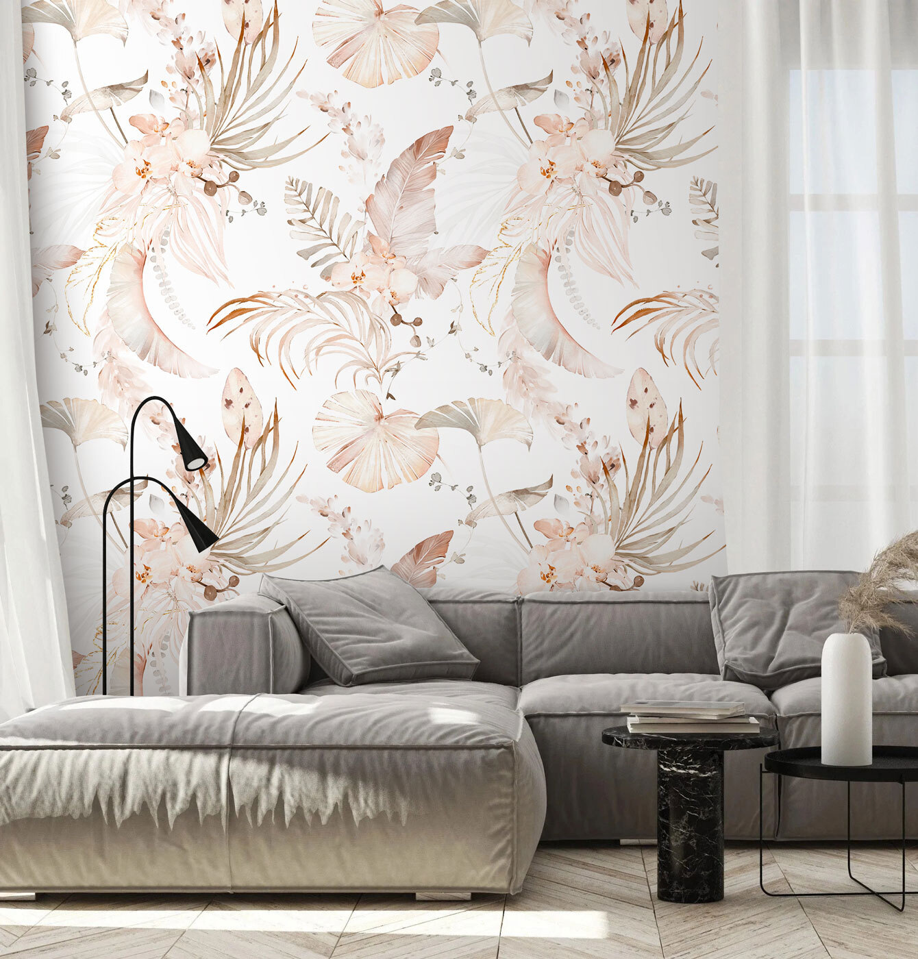 Stel je voor dat je een kamer binnenstapt waar de muren tot leven komen – dat is precies wat deze ‘muurschildering met bloemen- en bladerenpatroon’ doet! Het is een prachtige dans van zachte bloemen en elegante bladeren, die een gezellige, zonnige sfeer uitstralen waardoor je zin krijgt om een kopje thee te pakken en te ontspannen. Perfect voor een woonkamer of een dromerige slaapkamer, het is alsof je een geheime tuin in huis hebt. Vrienden zullen midden in hun zin stoppen, betoverd door de schoonheid. En laten we eerlijk zijn, wie wil er nu niet het gevoel hebben dat hij zich in een eeuwigdurende natuurretraite bevindt? De subtiele kleuren van deze muurschildering stralen warmte en rust uit en veranderen elke ruimte in een oase.