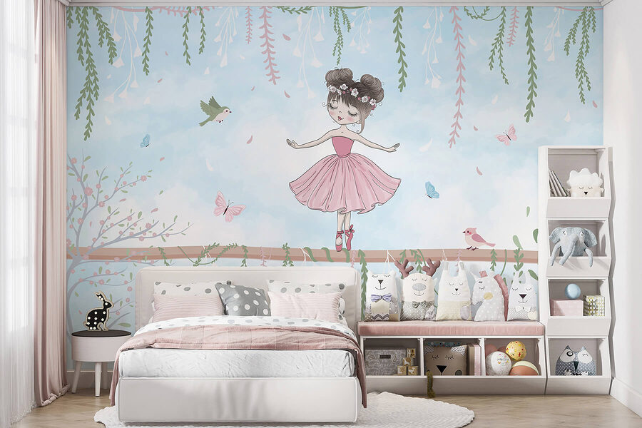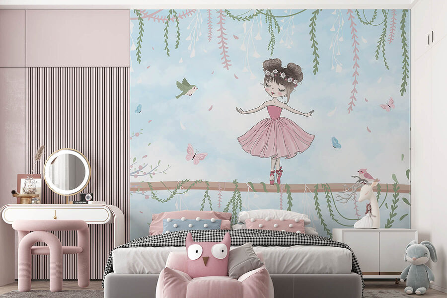Stap in een dromerige wereld met deze betoverende muurschildering van een charmant meisje in een roze jurk, perfect in evenwicht op een tak. Omringd door fladderende vlinders en speelse vogels, lijkt het wel een scène uit een prachtig sprookje. Stel je voor hoe dit een gezellig leeshoekje opfleurt of vreugde brengt in de kamer van een kleintje. De zachte kleuren en speelse details nodigen uit tot glimlachen, waardoor elke blik voelt als een warme knuffel. Stel je voor dat je thee drinkt, naar haar gratie staart en je verliest in de verhalen die ze inspireert – serieus, wie zou dat niet willen? Deze muurschildering is niet alleen decoratie, het is een magische ontsnapping!
