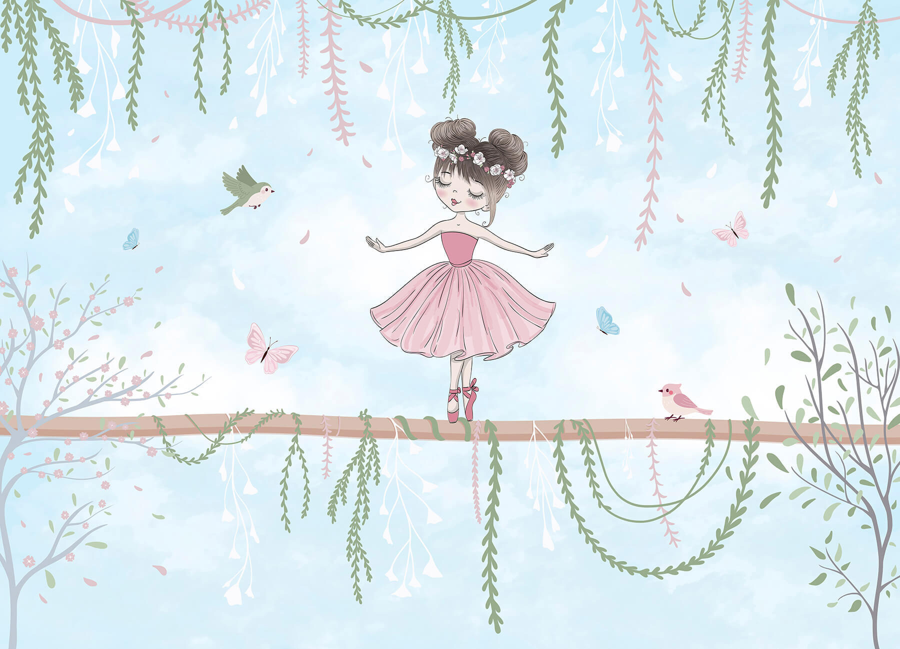 Stap in een dromerige wereld met deze betoverende muurschildering van een charmant meisje in een roze jurk, perfect in evenwicht op een tak. Omringd door fladderende vlinders en speelse vogels, lijkt het wel een scène uit een prachtig sprookje. Stel je voor hoe dit een gezellig leeshoekje opfleurt of vreugde brengt in de kamer van een kleintje. De zachte kleuren en speelse details nodigen uit tot glimlachen, waardoor elke blik voelt als een warme knuffel. Stel je voor dat je thee drinkt, naar haar gratie staart en je verliest in de verhalen die ze inspireert – serieus, wie zou dat niet willen? Deze muurschildering is niet alleen decoratie, het is een magische ontsnapping!