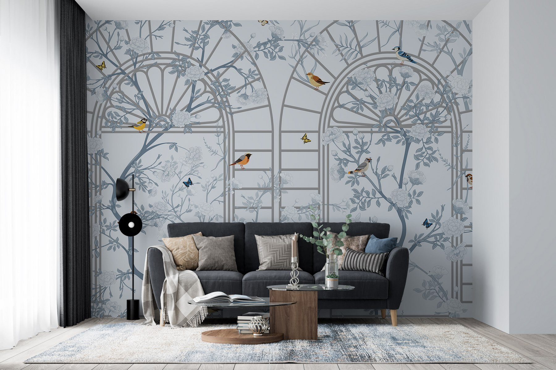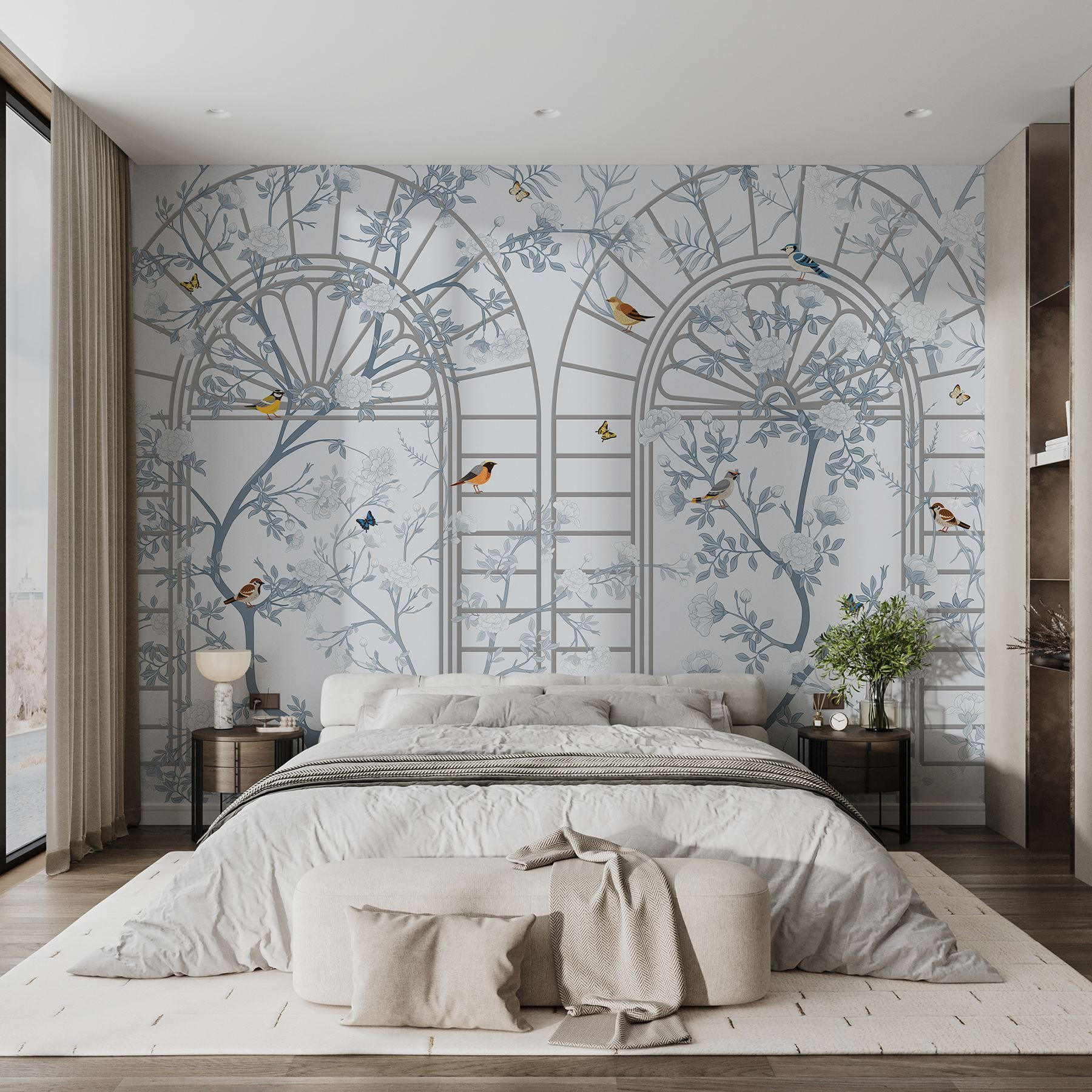 Transformeer uw ruimte met deze prachtige muurschildering met een dromerige mix van vogels en bloemen. Stel u eens voor hoeveel rust dit brengt, bijna als een kalmerende frisse wind die fluistert: “Hé, ontspan eens een beetje!” De delicate ladder en het gedetailleerde bloemmotief creëren een lichte, luchtige sfeer die aanvoelt alsof u een rustige tuin binnenstapt – zelfs als het enige dat in uw huis groeit die oude plant op de vensterbank is. En die vogels? Ze lijken klaar om te kletsen, alsof ze de mooiste melodieën zingen, speciaal voor jou. Deze muurschildering is perfect voor een gezellig leeshoekje of een uitnodigende hal en voegt een vleugje persoonlijkheid toe die zegt: “Het leven is een beetje grillig, en dat is prima!” Wie zou dat niet willen?