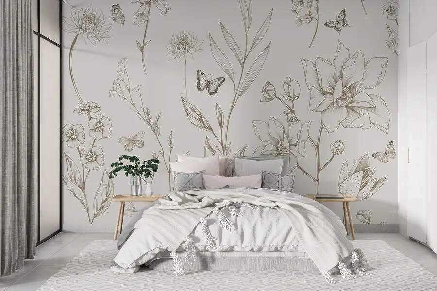Heb je er ooit van gedroomd om de sereniteit van een zonnige bloemenweide in je interieur te brengen, maar dan zonder insecten? Kijk dan eens naar deze prachtige “Muurschilderingen w08088v1” uit onze Vlinder Muurschilderingen en Natuur categorieën. Het is alsof iemand een delicate potloodschets van een tuin heeft vastgelegd, besprenkeld met vlinders. Stel je voor: die fijn getekende bladeren en bloemen die een subtiele, elegante achtergrond creëren. Mooi, toch?