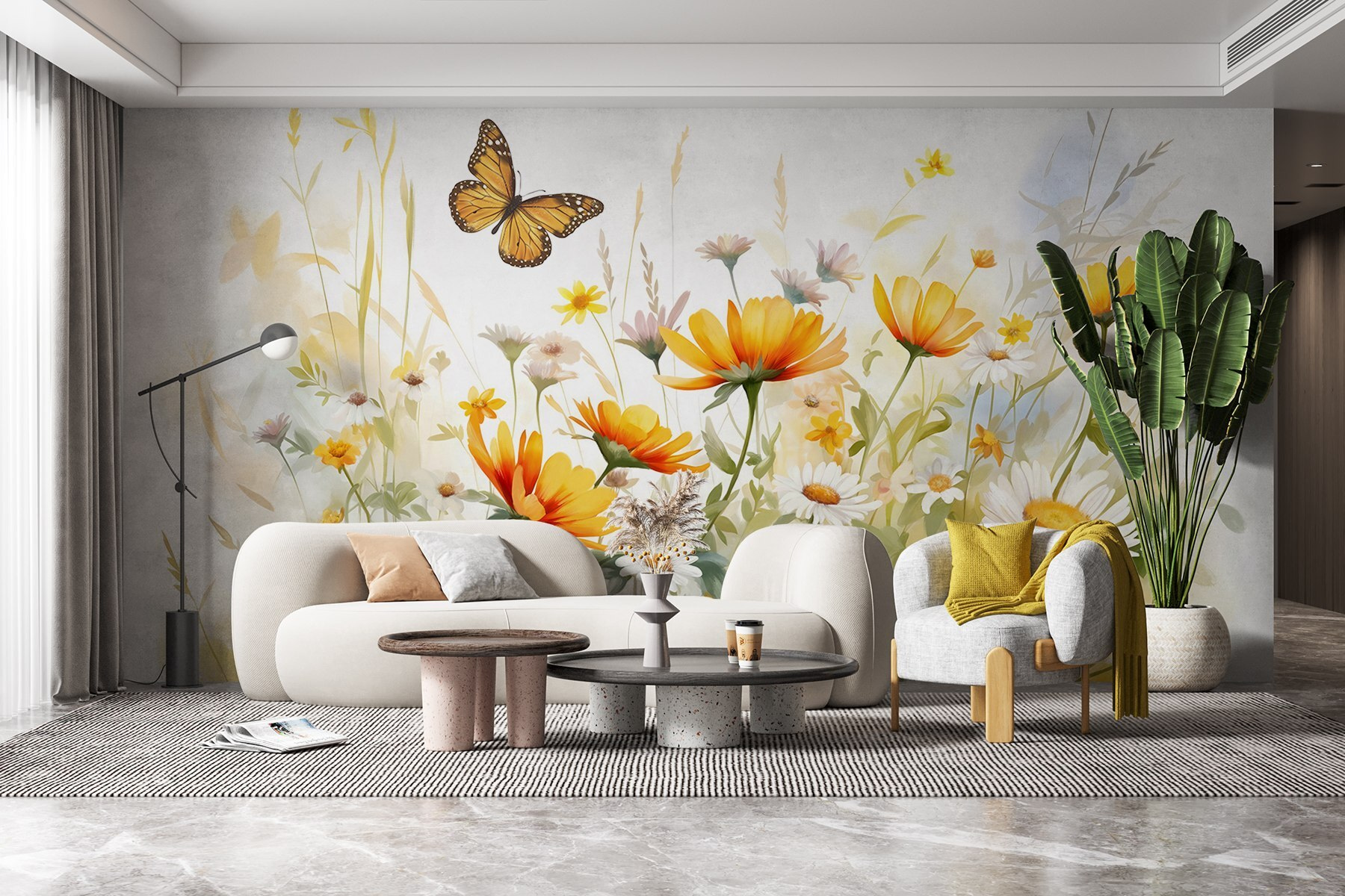 Tover je ruimte om in een levendige tuin met deze prachtige muurschildering van een vlinder die over een bloemenveld fladdert. Het brengt een speels vleugje natuur, waardoor elke kamer fris en uitnodigend aanvoelt. Stel je voor dat je koffie drinkt terwijl je je koestert in dit vrolijke tafereel. Het is net alsof je een beetje lente op je muur hebt, zonder de pollenhoofdpijn. De uitbarstingen van kleur kunnen je humeur opkrikken en je omgeving inspireren. Het is de perfecte achtergrond voor een gezellig leeshoekje of een levendige speelkamer. Wie zou er niet in deze bloemenfantasie willen duiken?