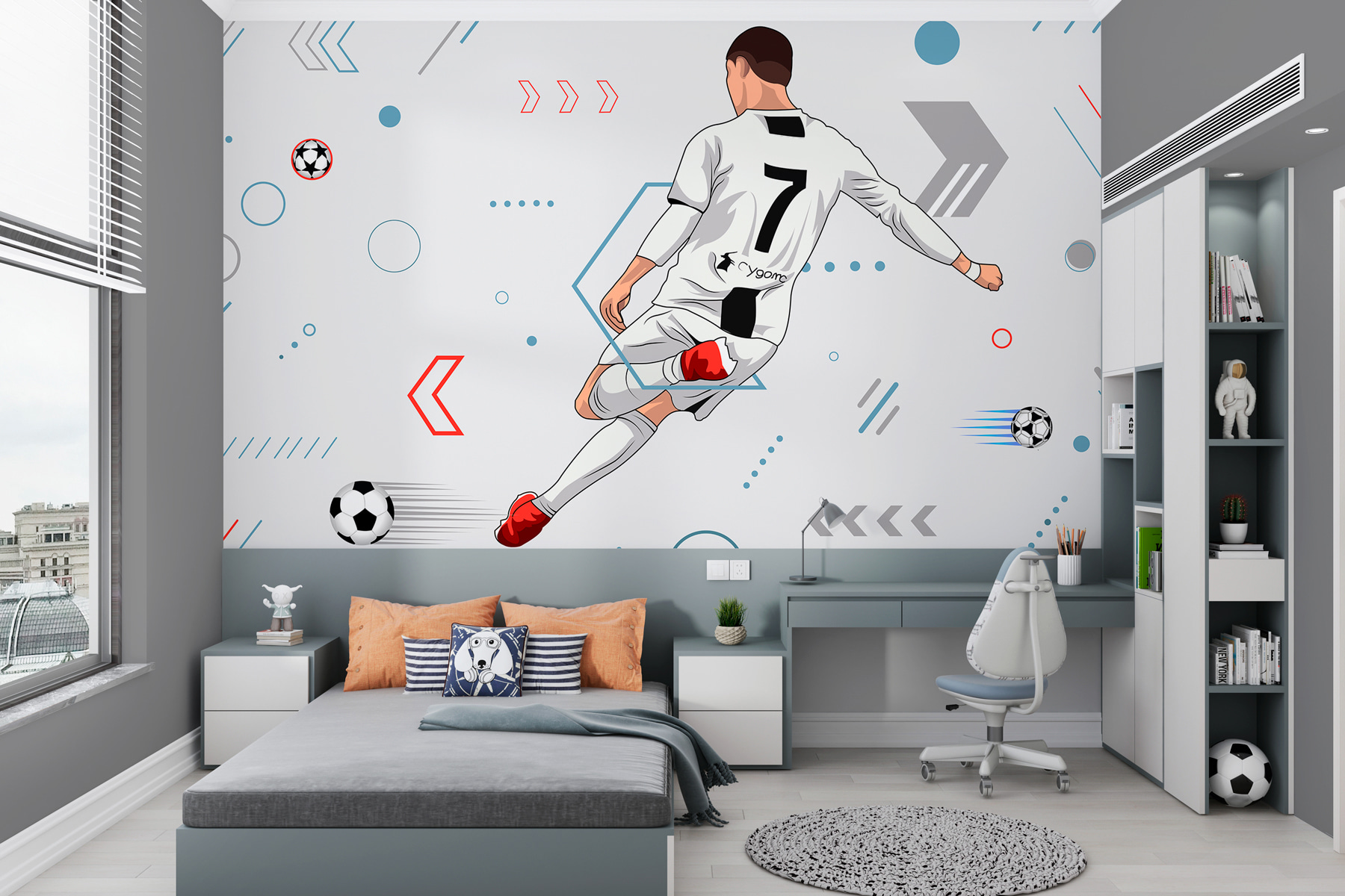 Stel je voor dat je je kamer binnenloopt en begroet wordt door deze epische muurschildering van een voetballer die uit alle macht een bal trapt. Je kunt de energie en passie bijna van de muur voelen springen! Perfect voor elke voetbalfan, of je nu een toekomstige Messi in de dop hebt of iemand die gewoon van het mooie spel houdt. Met dynamische lijnen en gedurfde kleuren maakt deze muurschildering een statement – alsof je een ministadion in huis hebt. Ideaal voor een kinderkamer, man cave of zelfs je kantoor als je je een beetje avontuurlijk voelt. Elke keer dat je er naar kijkt, zie je de spanning van de wedstrijd en misschien voel je je zelfs een beetje geïnspireerd om je dag te beginnen met dezelfde vurige geest. Het is niet zomaar een decoratie, het is een uitbarsting van opwinding aan je muur!