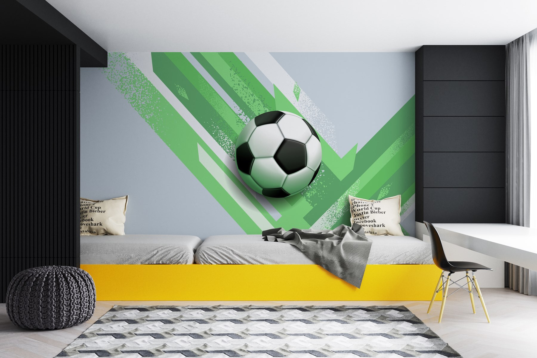 Verander die gewone muur in een levendige viering van voetbal met deze muurschildering “Football Ball on a Green and White Background”. Het is niet zomaar een decorstuk; het is een uitnodiging om te dagdromen over epische wedstrijden, doelpunten in de laatste minuut en het zoete geluid van een bal die de achterkant van het net raakt. Stel je voor: kinderen die rondschoppen in de woonkamer of vrienden die samenkomen voor wedstrijdavonden – deze muurschildering vormt de perfecte achtergrond. Het frisse groen zorgt voor een levendige sfeer, waardoor elke ruimte energieker aanvoelt. Of je nu een die-hard fan bent of gewoon een beetje sportieve flair waardeert, het voegt dat perfecte vleugje plezier toe. Misschien inspireert het zelfs wel tot een vriendschappelijke wedstrijd in je eigen achtertuin!