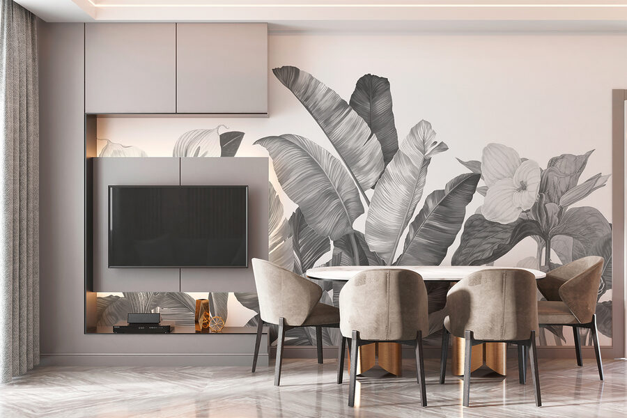 Stel je voor dat je een kamer binnenloopt en BAM – je bent in je eigen tropische paradijs. Dat is wat deze muurschildering doet. “Monochrome tropische bladeren en bloemen” is niet alleen een naam; het is een hele vibe. Denk er eens over na – dikke bananenbladeren die zich mengen met exotische bloemen, allemaal in een rustgevende grijstint die op de een of andere manier kalm en stijlvol aanvoelt. Perfect voor iedereen die van de jungle houdt, maar niet van muggen, toch?