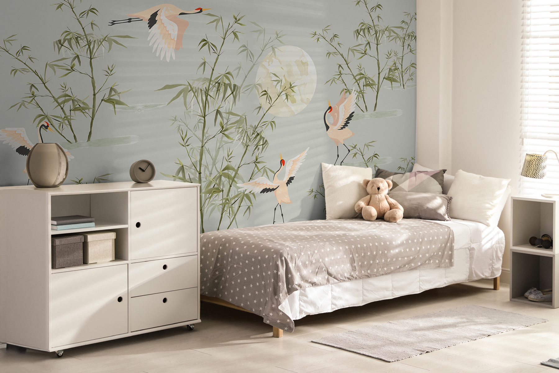 Verander elke ruimte in een serene ontsnapping met deze prachtige muurschildering met kraanvogels en bamboe onder een maanverlichte hemel. Het is alsof je de natuur in huis haalt, en laten we eerlijk zijn, wie wil er nu geen vredig, maanverlicht tafereel om naar te staren tijdens die lange dagen thuiswerken? Stel je voor: je kijkt omhoog naar de elegante kraanvogels tijdens hun vlucht en je voelt een gevoel van rust over je heen komen. Het is grillig genoeg om bij weg te dromen, maar toch geaard genoeg om in elke kamer te passen. Geef je muren een opfrisbeurt – het is niet alleen decor, het is een ervaring die staat te gebeuren!