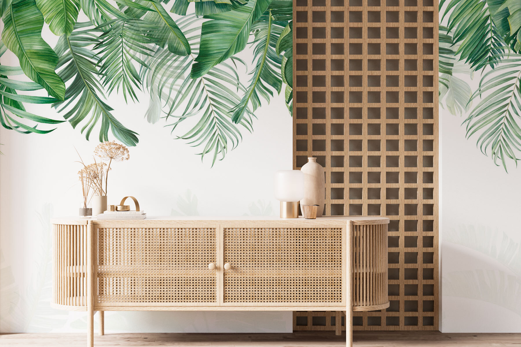 Tover je kamer om in een tropisch paradijs met de “Row of Green Leaves” muurschildering. Stel je voor dat je in een zonovergoten jungle stapt telkens als je je kamer binnenloopt – wat een traktatie! Het weelderige groen zorgt voor een verfrissende sfeer, waardoor het levendig en uitnodigend aanvoelt. Perfect voor gezellige avonden met vrienden of gewoon om te genieten van de schoonheid onder het genot van een kopje koffie.