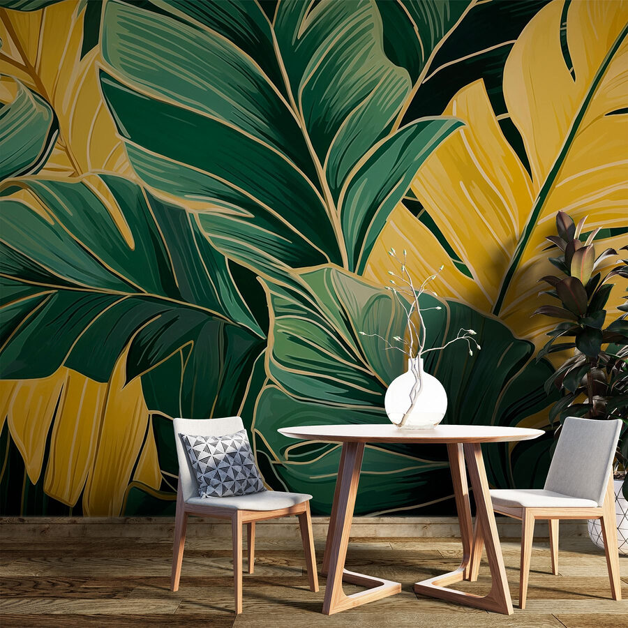 Haal het buitenleven naar binnen met deze prachtige muurschildering, “Levendig gebladerte in geel en groen”. Stel je voor dat je elke dag wakker wordt met een tropische oase in je woonkamer. Die felle gele en weelderige groene bladeren knallen alsof ze net door de zon zijn gekust. Het is net een mini-vakantie aan je muur! Vrienden zullen zich afvragen of je een geheime tuin in de tuin hebt.
