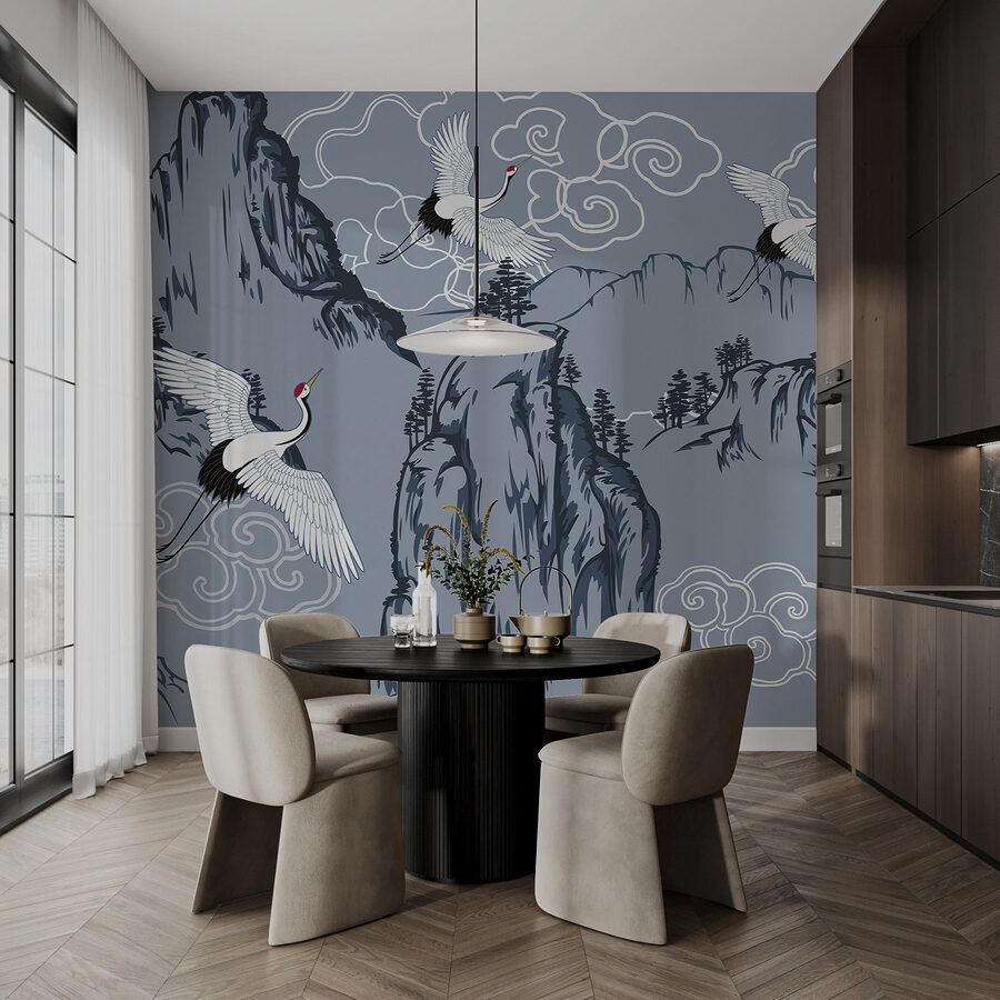Verander je ruimte in een serene ontsnapping met deze prachtige muurschildering met sierlijke vogels die over majestueuze bergen zweven. Het is alsof je een beetje natuur in huis haalt zonder alle pollen. Stel je voor dat je ‘s ochtends aan je koffie nipt terwijl je je op een vredige bergtop waant – zonder de wandelschoenen. De zachte kleuren en ingewikkelde details nodigen uit tot rust, perfect voor een gezellige leeshoek of een rustige slaapkamer. Bovendien is het een geweldige gespreksstarter! Gasten zullen nieuwsgierig zijn naar die elegante kraanvogels en jij hebt het perfecte verhaal al klaar. Het is meer dan alleen decor; het is een stukje zen voor aan je muur. Verfris je kamer en laat je muren verhalen van het buitenleven fluisteren!