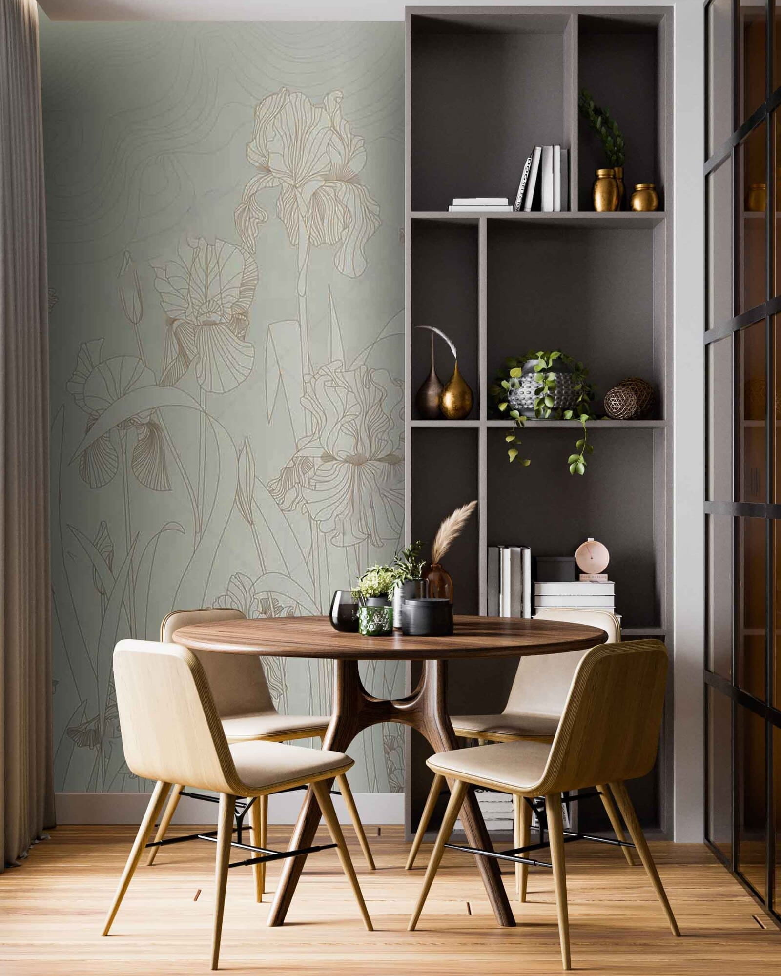 Transformeer uw ruimte met ‘Whispers of Nature in Soft Hues’. Deze muurschildering voelt als een rustige wandeling door een vredige tuin, waar elk bloemblad geheimen van sereniteit fluistert. De zachte, gedempte kleuren creëren een rustgevende achtergrond, perfect om weg te dromen of de eindeloze takenlijstjes van het leven aan te pakken. Stel je voor dat je thee drinkt terwijl je omringd bent door delicate irisbloemen, waarvan de elegantie rust in je huis brengt. Het is alsof je een stukje buiten naar binnen haalt, zonder de vervelende insecten! Deze muurschildering is gemakkelijk aan te brengen en nog gemakkelijker om van te houden, en verandert elke muur in een serene ontsnapping.