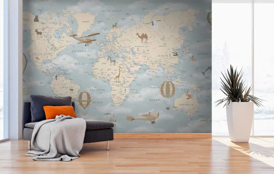 Stel je voor dat je een kinderkamer binnenstapt en begroet wordt door een charmante muurschildering van heteluchtballonnen die sereen over een pastelkleurige wereldkaart zweven. Het is alsof je een reis rond de wereld maakt vanuit je eigen huis. Deze muurschildering is perfect om nieuwsgierigheid en dagdromen op te wekken en zit boordevol grillige details – speelse dieren, vintage vliegtuigen en natuurlijk die dromerige heteluchtballonnen die hoog boven de oceanen en continenten zweven alsof ze hun eigen kleine avontuur beleven.