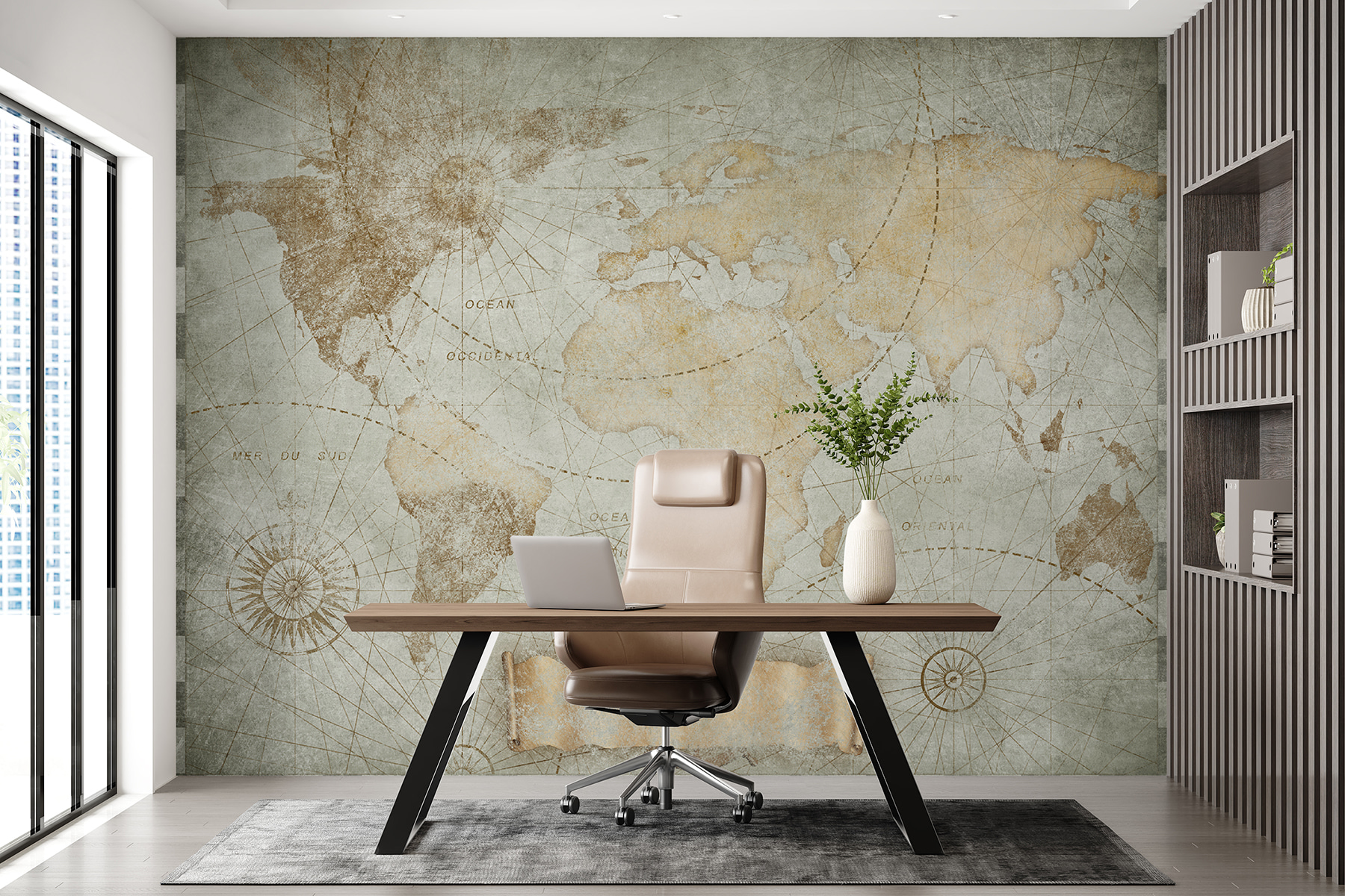 Bekijk deze muurschildering met vintage wereldkaart – het is net alsof je een stukje geschiedenis aan je muur hebt hangen. Deze muurschildering is perfect voor reisliefhebbers of iedereen die van antiek houdt en brengt een ouderwetse charme in elke kamer. Stel je voor dat je je met een boek onder deze gedetailleerde kaart nestelt en met je vinger oude routes natrekt. De gedempte tinten en de verouderde look geven het een gezellig, doorleefd gevoel. Het is niet alleen decor – het is een gespreksonderwerp. En misschien inspireert het wel je volgende grote avontuur. Een echte aanwinst voor je muren!