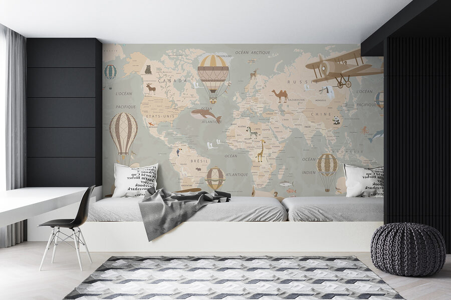 Stel je voor dat je elke dag wakker wordt met het zicht van heteluchtballonnen die over een wereldkaart zweven – dromerig! Deze muurschildering, getiteld “Hete luchtballon in de lucht”, combineert moeiteloos de reislust met de grillige charme van het zweven over de wereld. De muurschildering zit in categorieën als “Muurschilderingen van kinderen” en “Muurschilderingen van wereldkaarten”, dus je weet dat het perfect is voor een kinderkamer of gewoon voor een unieke inrichting. Stel je alle verhalen voor die het zou kunnen inspireren – denkbeeldige reizen door woestijnen, jungles en oceanen. Het is net een ticket naar avontuur in je woonkamer of speelruimte. Bovendien garanderen de serene pastelkleuren bijna dat je je elke keer dat je er naar kijkt een beetje lichter en zorgelozer voelt.