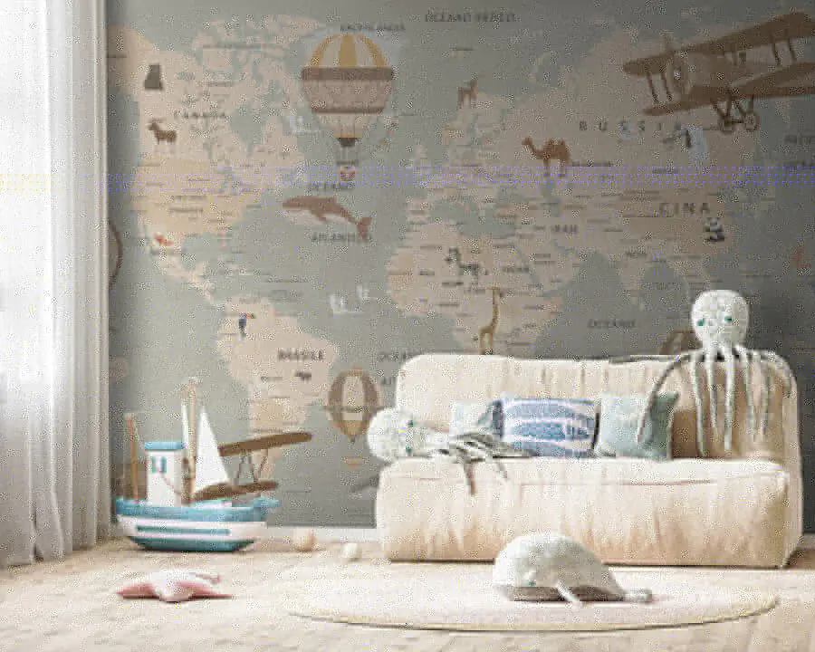 Stel je voor dat je elke keer dat je een kamer binnenloopt een wereld vol avontuur binnenstapt. Deze muurschildering van heteluchtballonnen die over een prachtig geïllustreerde kaart zweven, nodigt uit tot dagdromen over verre landen en magische reizen. Met levendige kleuren en charmante details is het net alsof je een minivakantie aan je muur hebt hangen. Stel je voor: kinderen of vrienden die bij elkaar zitten en plaatsen aanwijzen die ze willen bezoeken of herinneringen ophalen aan gemaakte reizen. Het is niet alleen een decoratie, maar ook een gespreksstof! Deze muurschildering is perfect voor een speelkamer, kantoor of gezellig leeshoekje en brengt vreugde en nieuwsgierigheid, waardoor elke ruimte een beetje grilliger aanvoelt. Wie zou er niet willen zweven op een ballon, althans in zijn verbeelding?