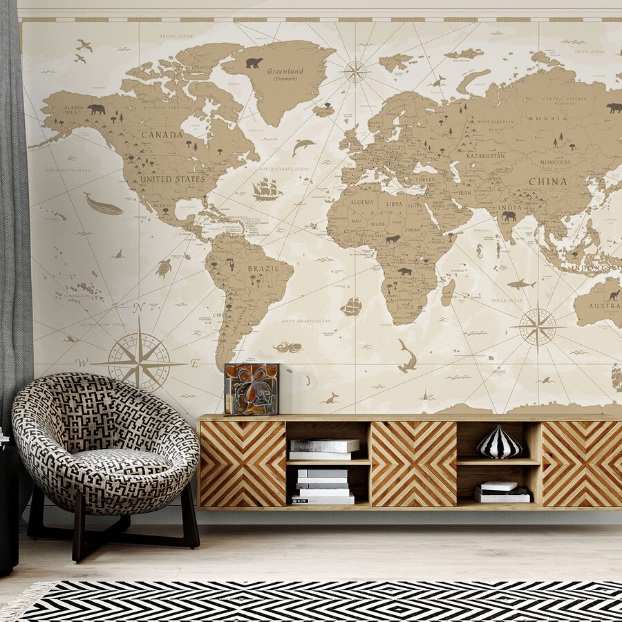 Denk er eens over na: een dagelijkse aardrijkskundeles vanuit je luie stoel. Kinderen kunnen dromen over verre oorden, en volwassenen? Nou, het zou je reislust wel eens kunnen aanwakkeren of je herinneren aan je laatste grote reis. Door de zachte tinten past het moeiteloos in elk interieur. Bovendien zijn er allemaal leuke kleine details – dieren, schepen en die ouderwetse kompasrozen – die een vleugje vintage charme toevoegen. Het is niet zomaar een muurschildering; het is net een reusachtig verhalenboek voor aan de muur. Absoluut perfect voor iedereen met een passie voor avontuur.